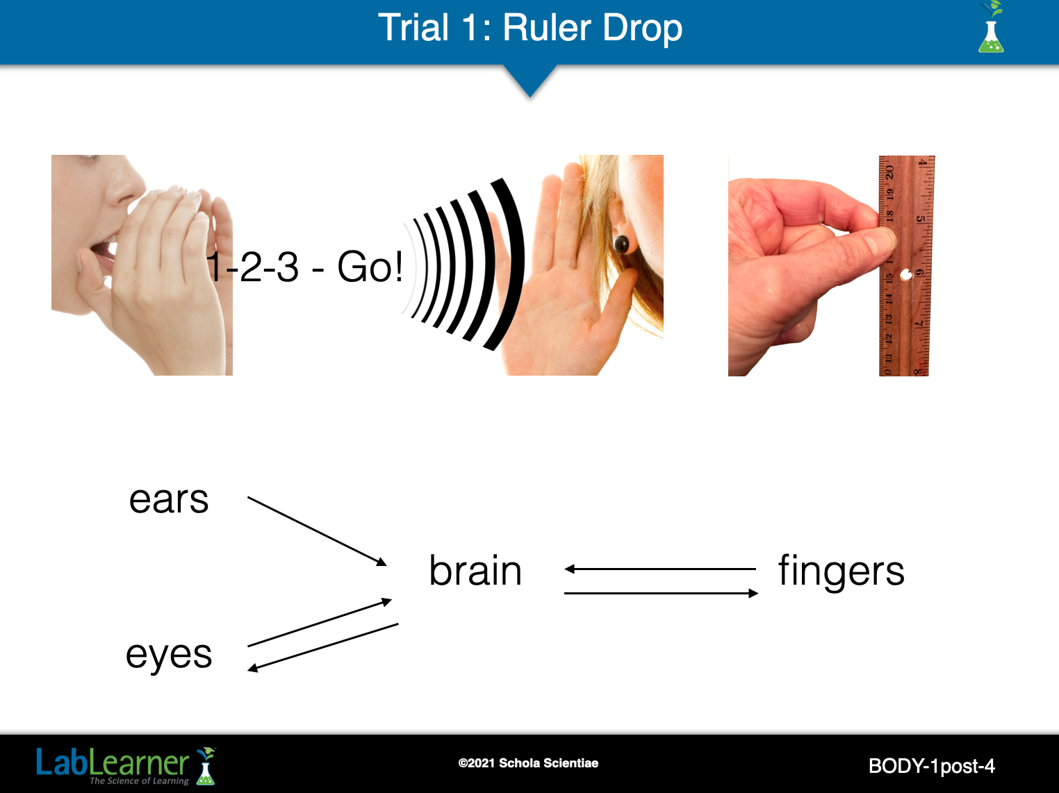 Trial 3: Follow-up by saying, “Think about Trials 3 and 4 performed in the lab. Both trials have one main element in common. When you listened to the noise the object made as it dropped, did you do something? Did your brain tell you to move—to blink, to catch a ruler, or to perform some other activity? No, when students listened to the object as it fell, they were thinking and processing but not moving. Some students may respond that they moved when they recorded their predictions, but encourage students to focus on the thinking process rather than the writing process.