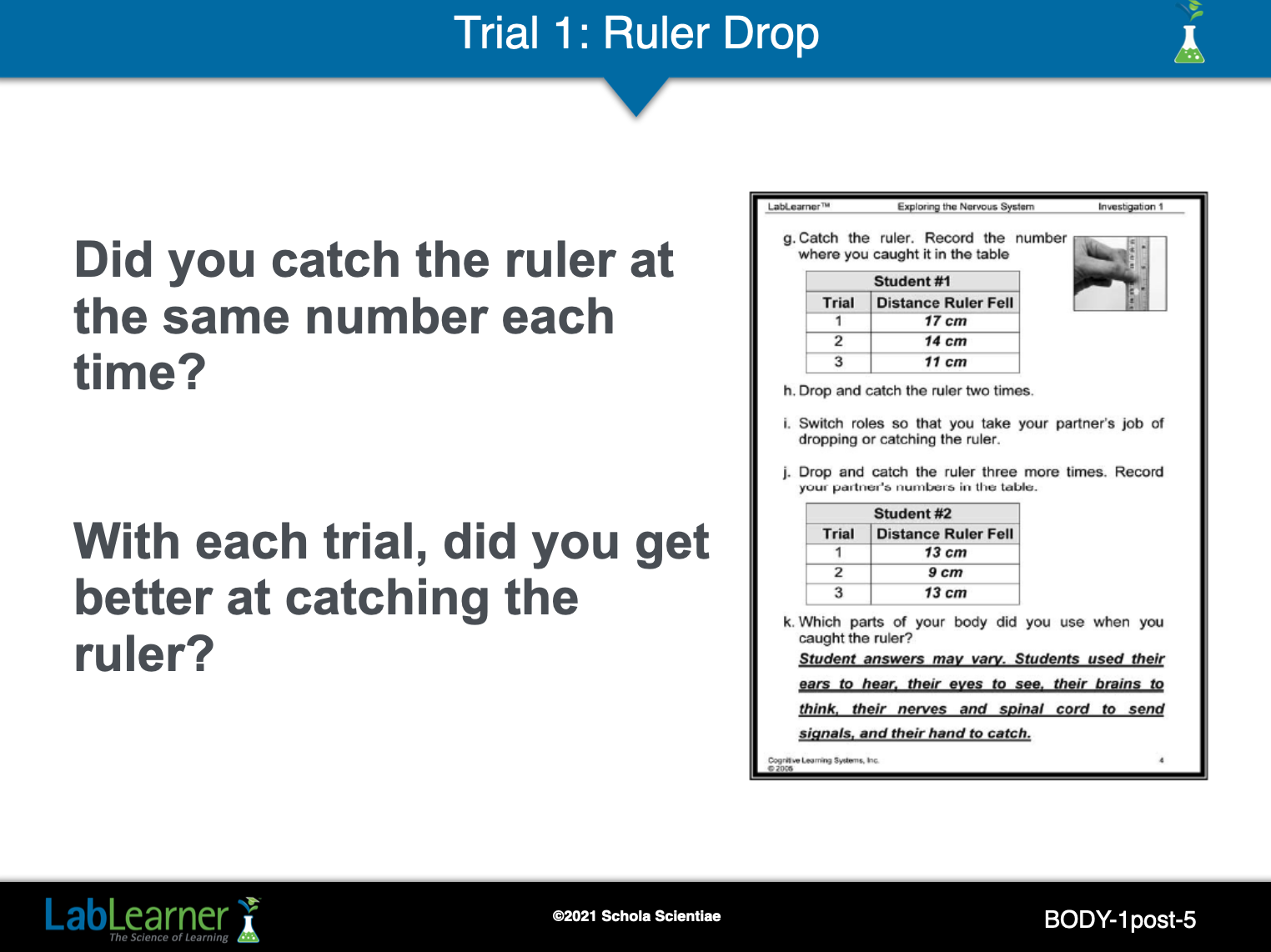 Next ask, “With each trial, did you get better at catching the ruler?” Student answers may vary. Some students may have improved with each trial.
