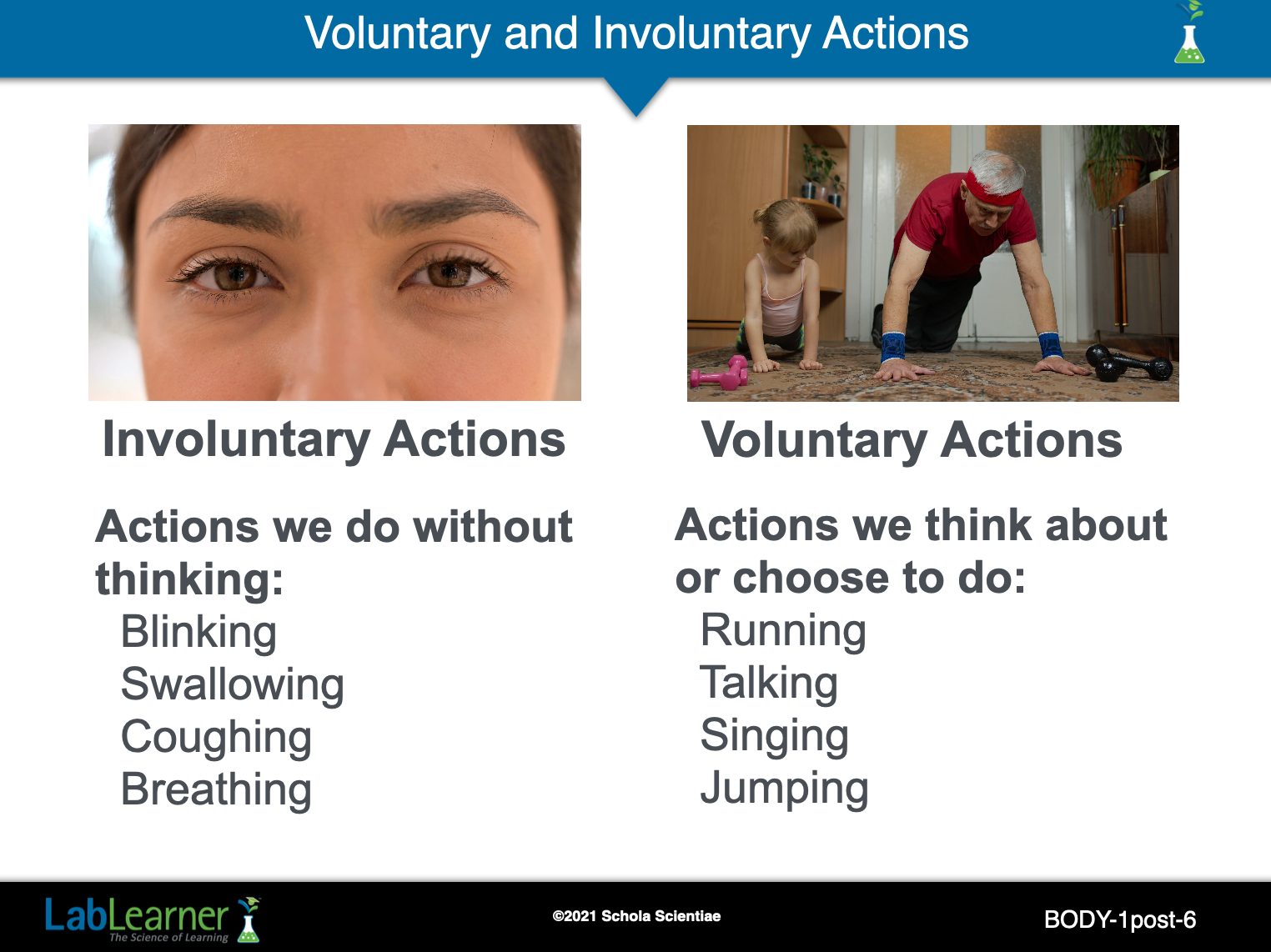 Tell students that the brain controls two different kinds of actions, voluntary and involuntary. Voluntary actions are those that we choose to do or think about doing. Involuntary actions are those that we do without thinking about them. We do not choose to do them; our bodies automatically do them. Blinking is an involuntary action.