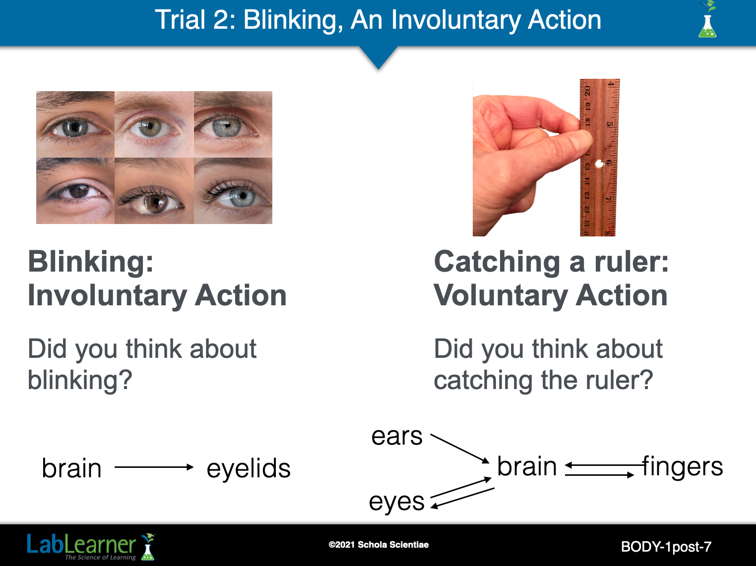 Begin questioning the students, “When you wanted to catch the ruler, you had to think about catching it. When you blinked, did you have to think about blinking?” No, students did not have to think about blinking.