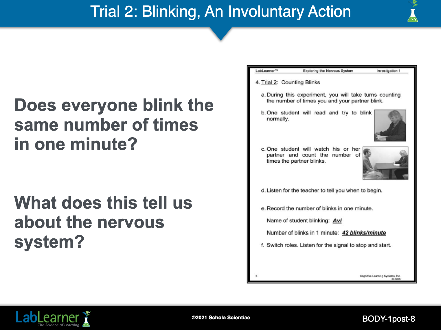 This slide begins a discussion of Trial 2 in which students investigated the involuntary action of blinking.