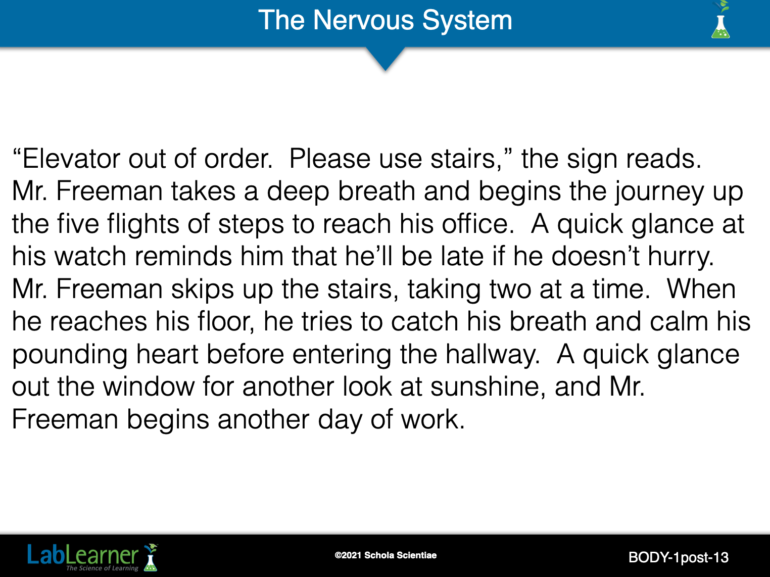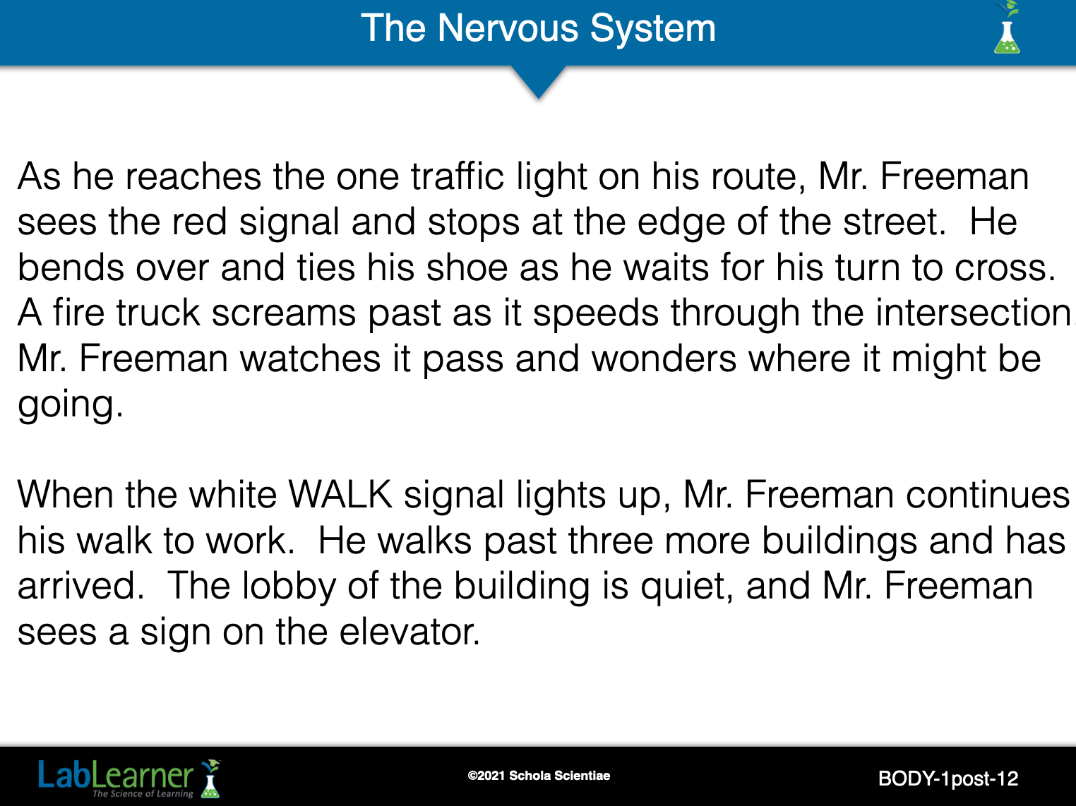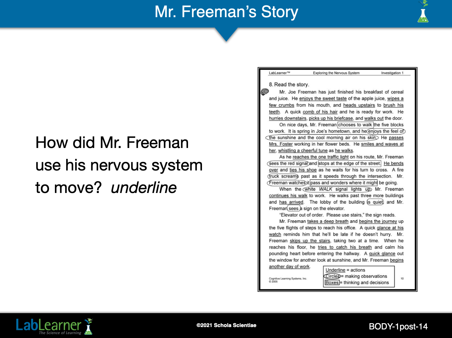This is the first of three slides in which you will use the short story to highlight times when Mr. Freeman used his nervous system to either perform actions, make observations, or think and make decisions.