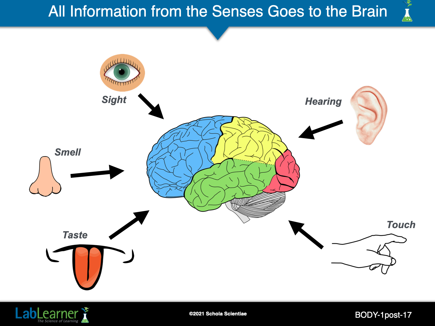 In this slide, we begin our effort to impress upon students that the five senses are part of the nervous system and feed directly to the brain for interpretation. The remaining slides will do the same, one sense at a time.