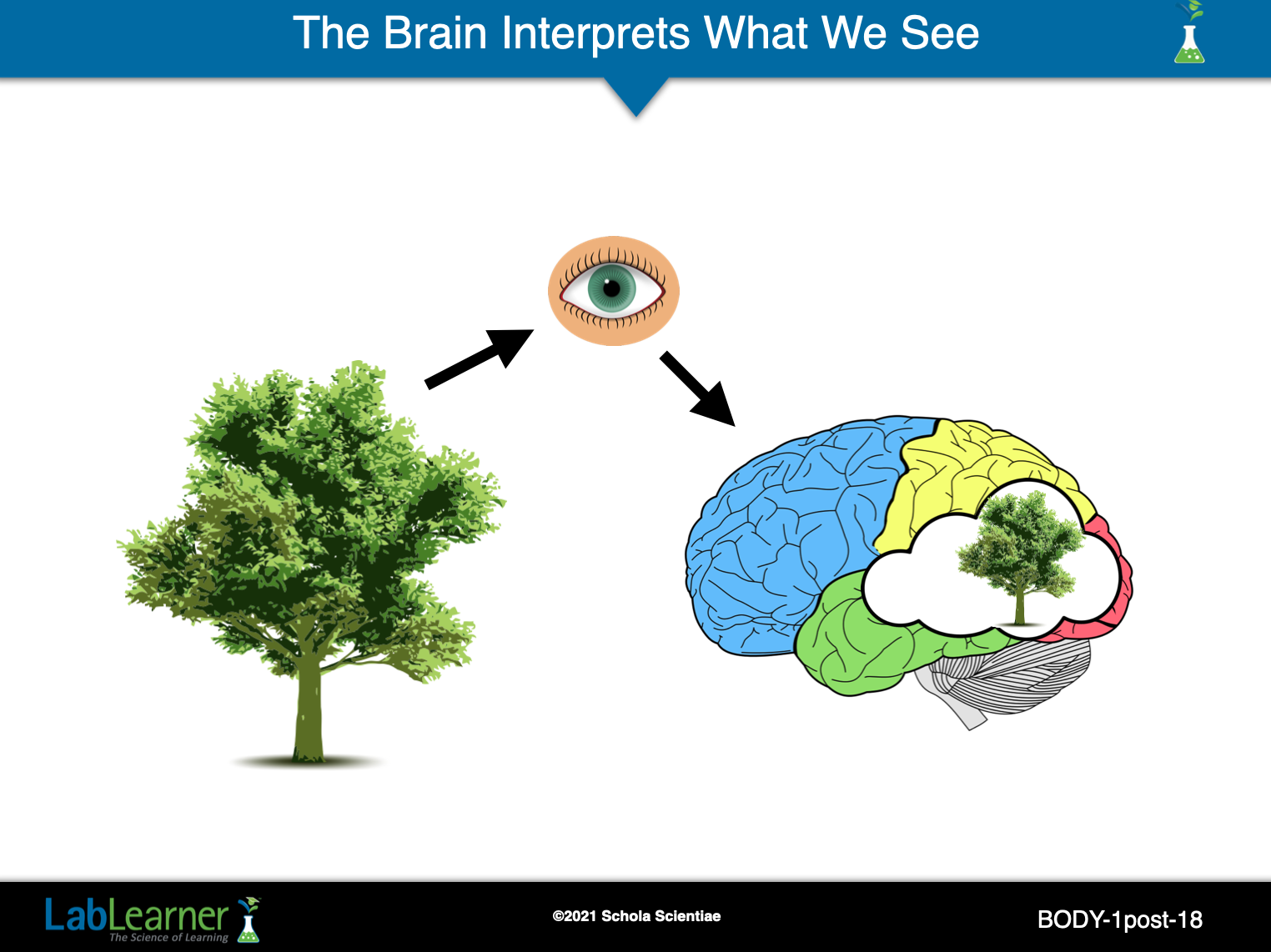 Note to Teacher: While we will not discuss this issue with students at this age, remember that the visual information from our eyes to the brain is only the initiation of an enormously complex series of neurological events collectively called cognition. Thus, our brain is capable of knowing that we are looking at a tree but then, through cognitive processing, compares it to other kinds of trees we have seen before and may even associate memories of similar images and events surrounding them.