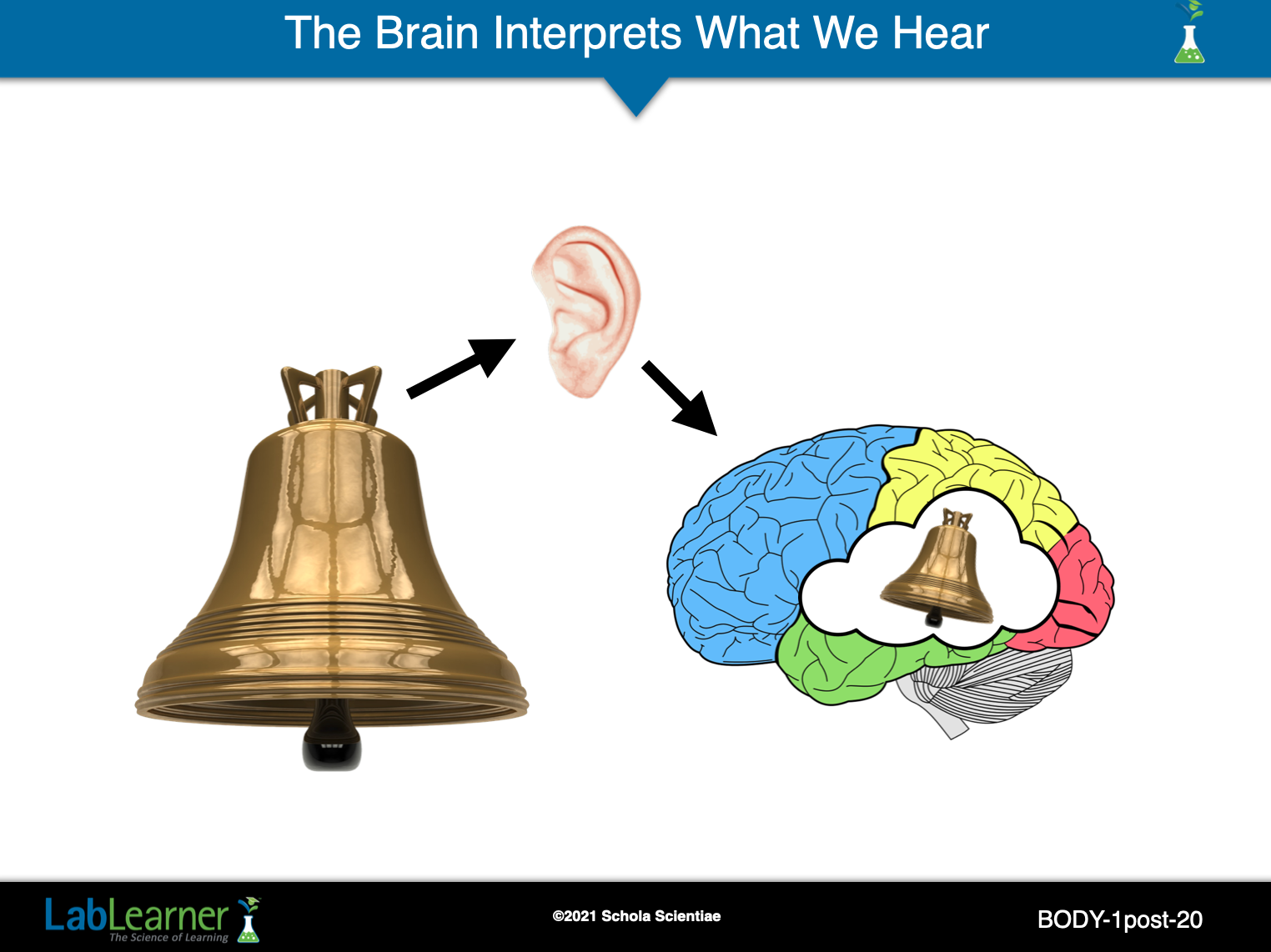 This slide is meant to impress upon students that hearing sounds in our surroundings, in this case, a bell is only interpreted as a bell by our brain. The ear itself has no idea or capacity to associate the sound waves it is collecting as the tone of a bell.