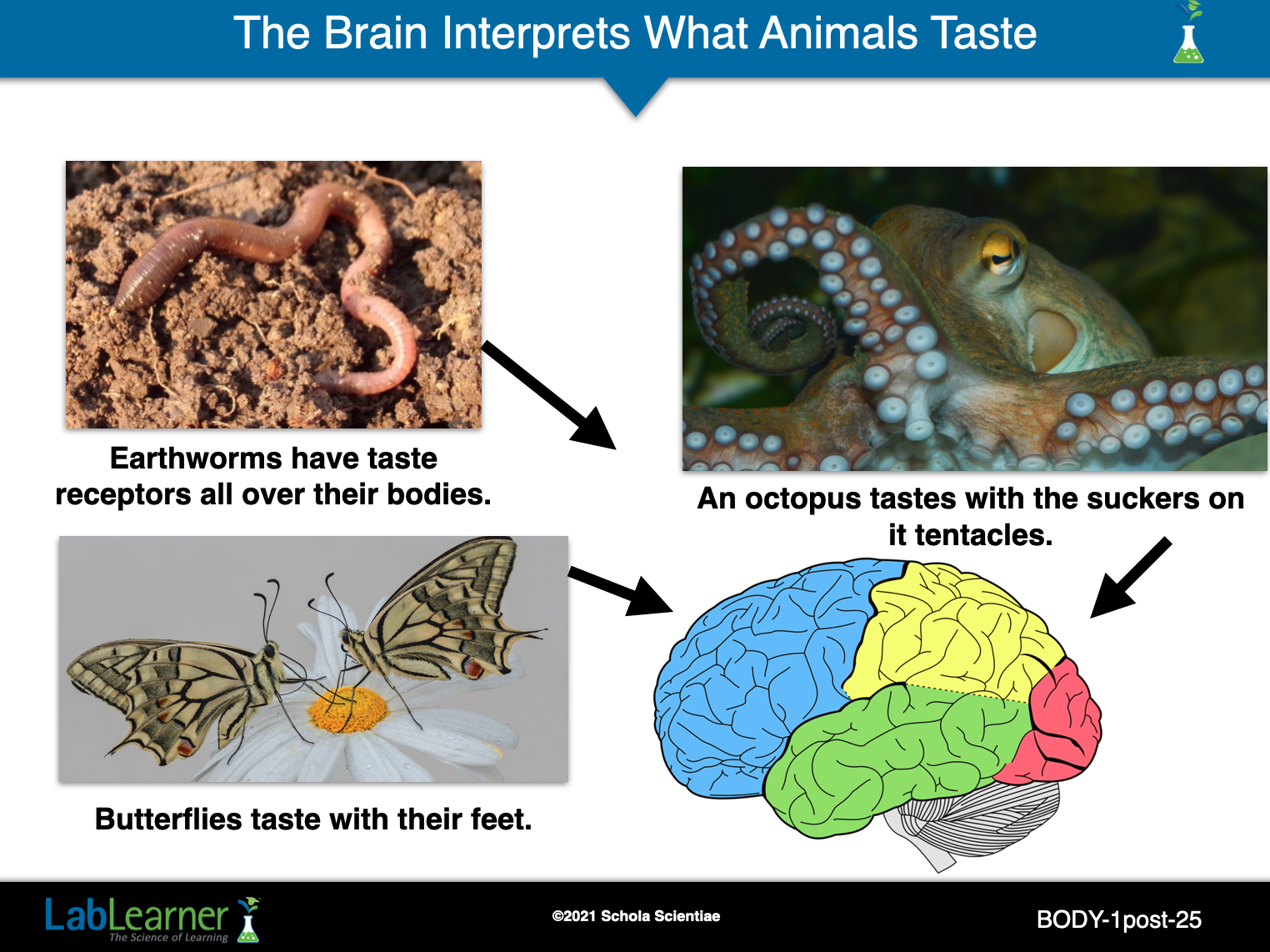 This slide emphasizes that animals can sense taste and that the sense of taste is transmitted to their brains for interpretation. Interestingly, this slide shows two invertebrates, animals without a backbone. Although earthworms and octopi are invertebrates, they each have a nervous system, which includes a brain.