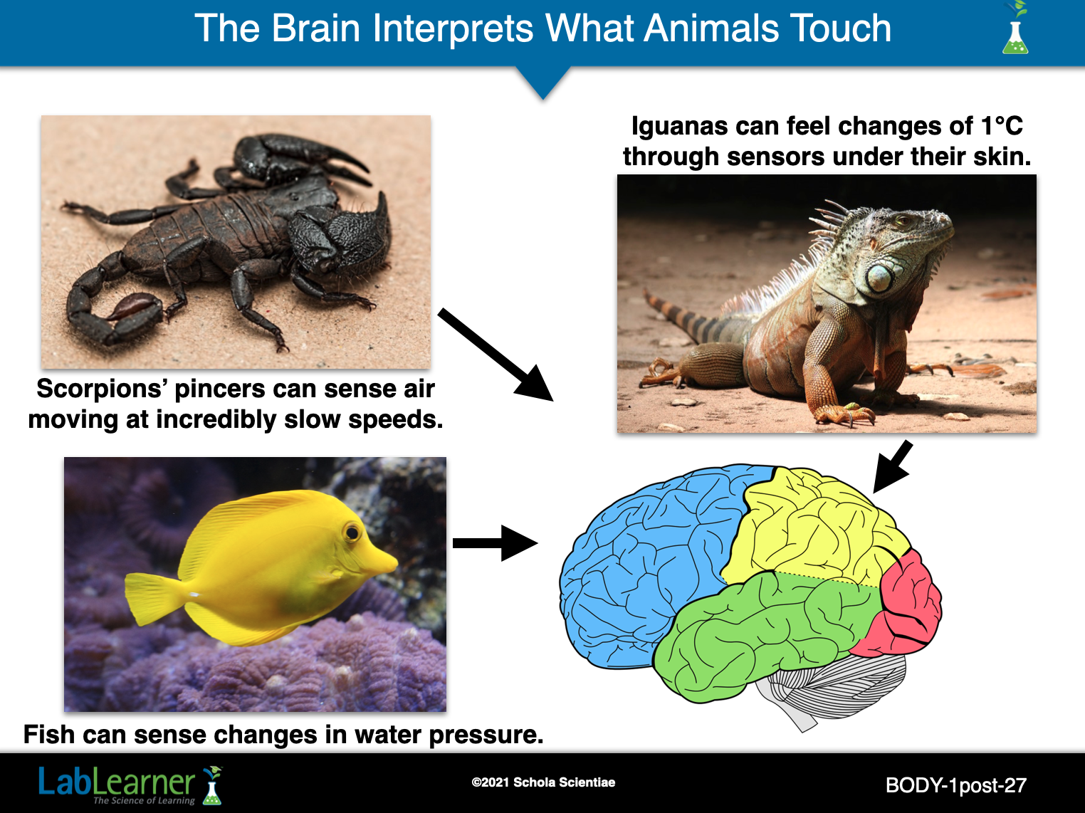 Just as humans have a sense of touch, so do other animals. Our sense of touch helps us to feel sensations such as temperature, pressure, and pain. Some of these same sensations are felt by other animals.
