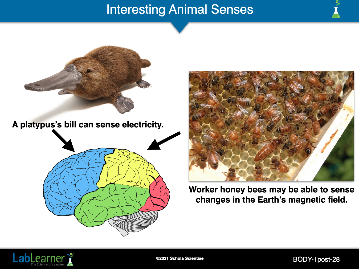 Students may find it interesting that some animals also have different senses than humans. For example, a platypus has electric sensors in its bill. These sensors can detect electricity as low as 0.05 microvolts. To give students an idea of just how low, it would take 30,000,000 microvolts to equal a 1 D cell battery.