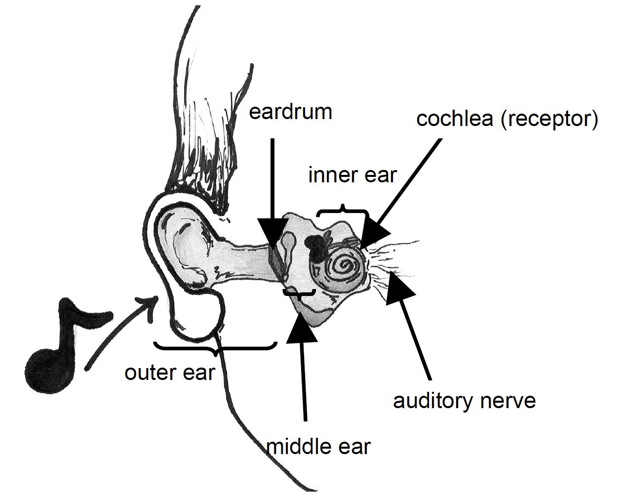 Sound travels through matter as a soundwave, which is a form of energy. It is our sense of hearing and the structures of the body involved in hearing that translate a soundwave into recognizable sounds. The outer ear consists of the part of the ear visible on the outside of the head, the ear canal, and the eardrum. The shape of the ear funnels sound into the ear canal and sound waves reach the eardrum. The eardrum consists of a membrane called the tympanic membrane, which is stretched tightly so that it responds with great sensitivity to the vibrations of sound waves. As the sound waves reach the eardrum, the membrane begins to vibrate.