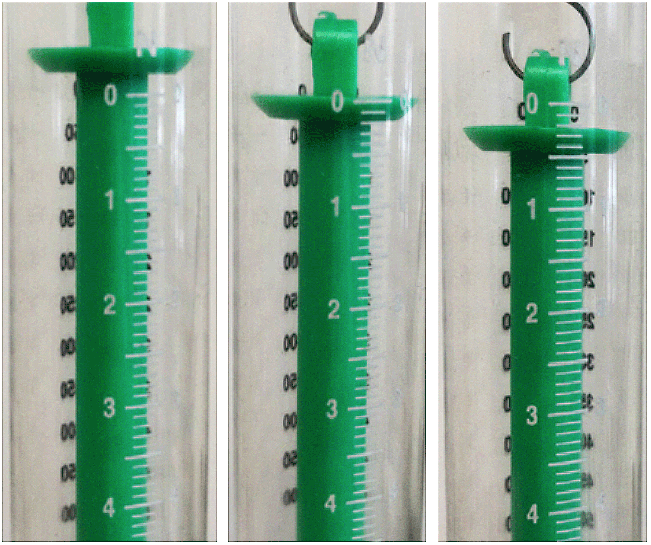 3. Equilibrate the spring scale. If the platform is not lined up with the 0 N mark, turn the nut at the top of the spring scale. Turning counterclockwise lowers the platform, and clockwise motion raises the platform (see pictures below: the scale on the left is too high above the zero calibration. The scale on the right is too low below the zero calibration. The scale in the middle is just right).