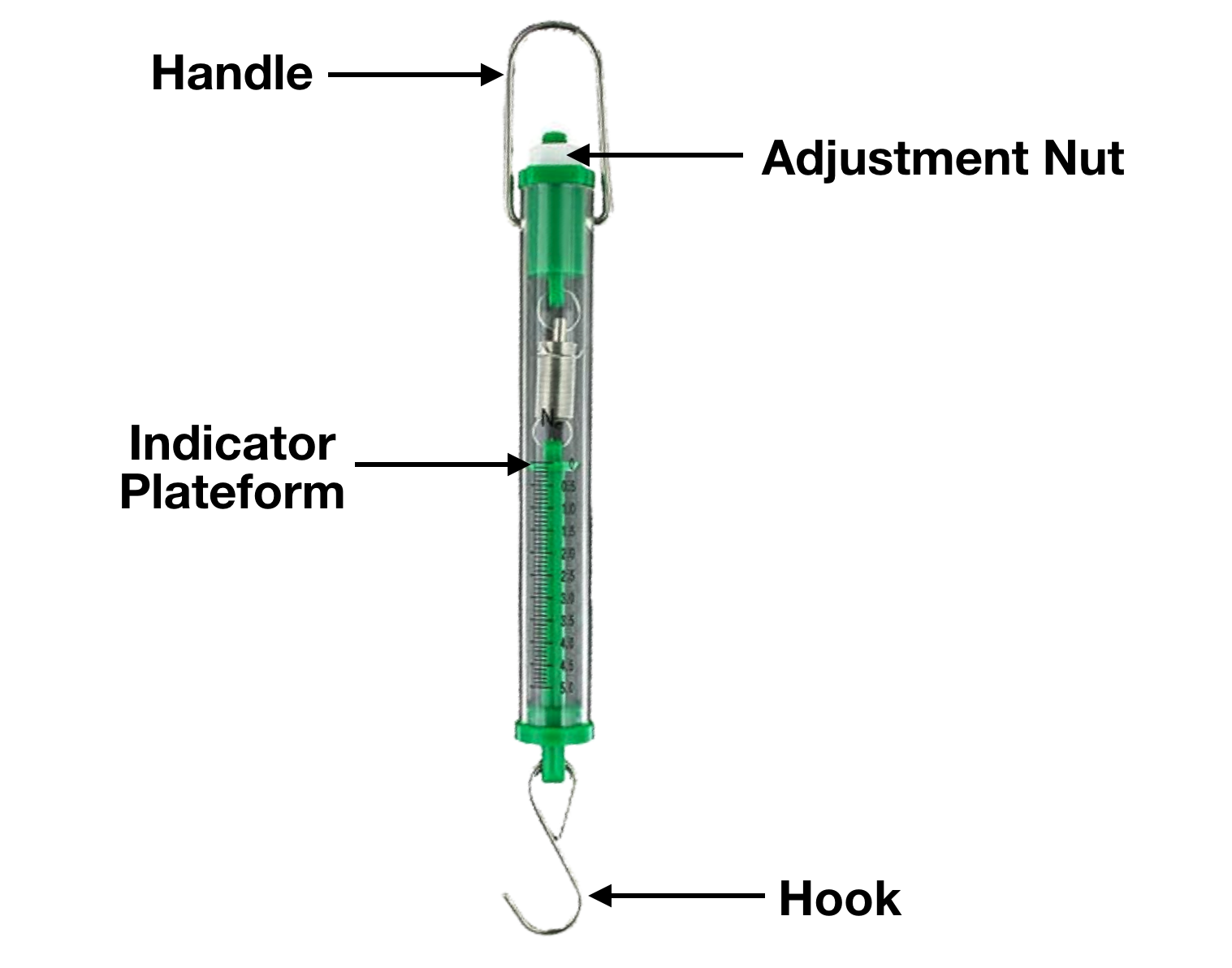 4. Place the load on the hook of the spring scale. Read from the side of the spring scale which has the newton scale. Each small line on the scale represents 0.1 N. Remember that the numbers on the spring scale increase as they go down the scale.