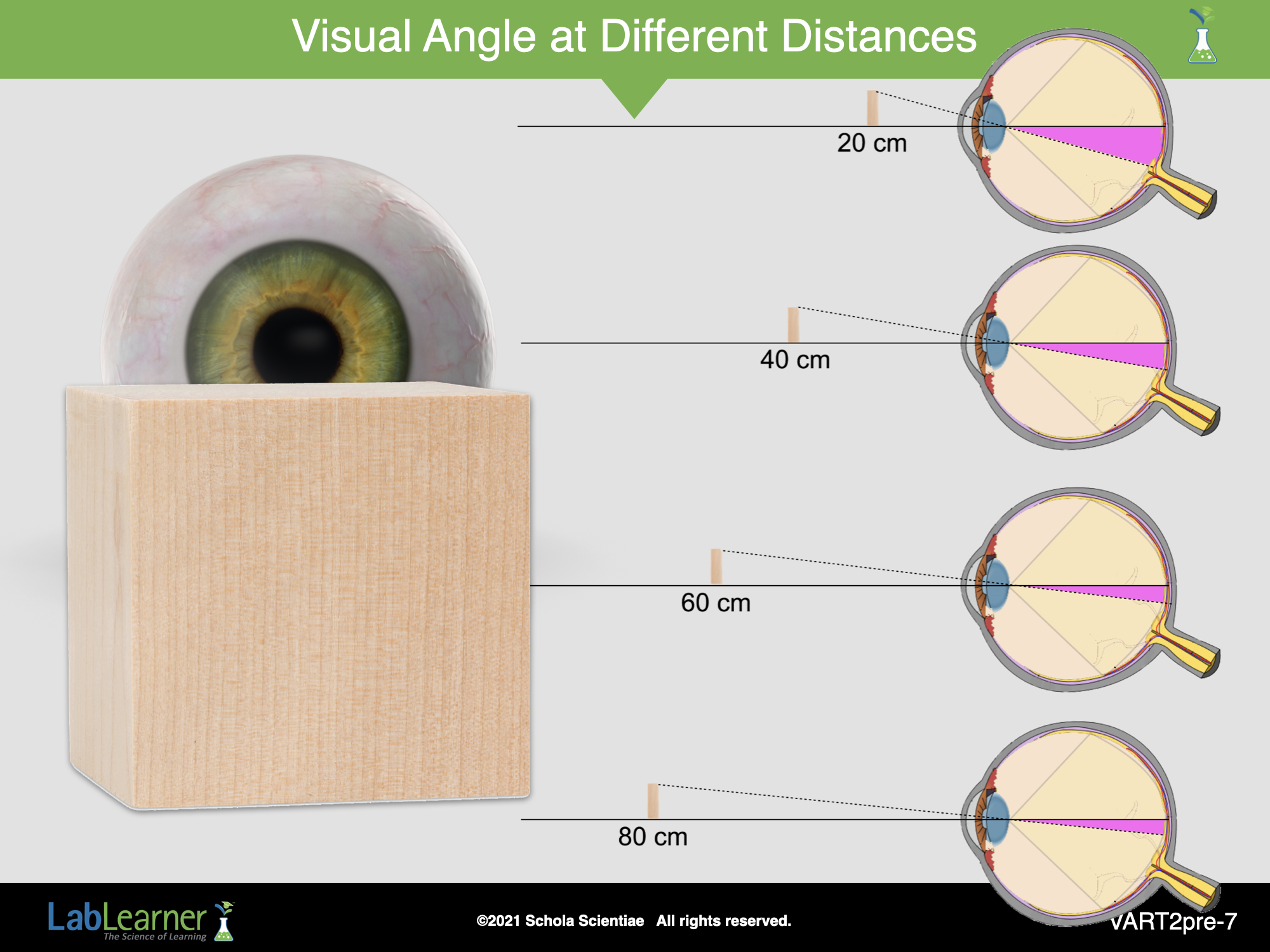 - show students that as the distance from an object increases, the visual angle of the object on the retina decreases, producing a smaller image of the object on the retina.