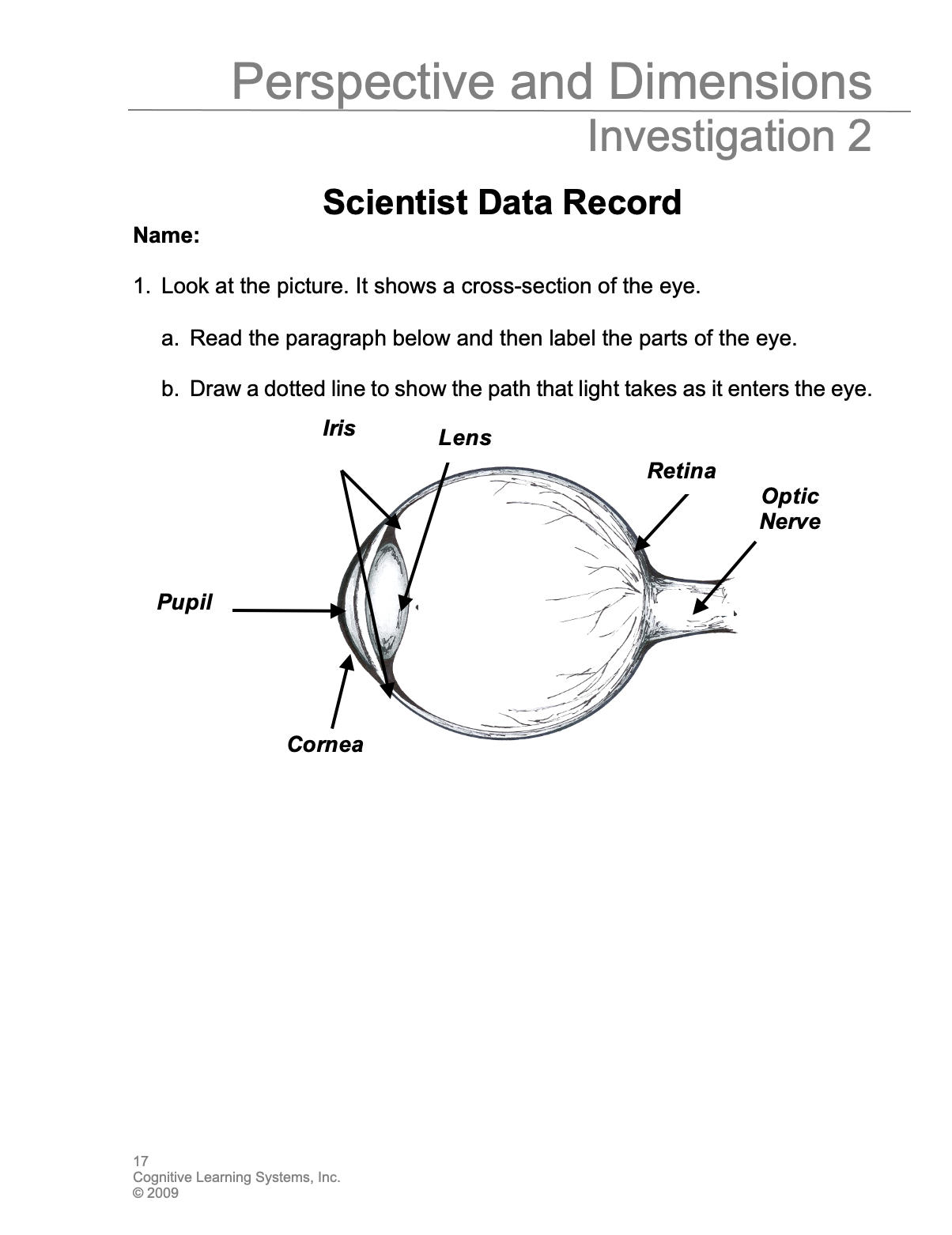 B. Continue the discussion of perspective and field of view by inviting students to look at a model of the eye. Encourage students to complete Problem 1 in their Student Data Record as a part of the discussion.