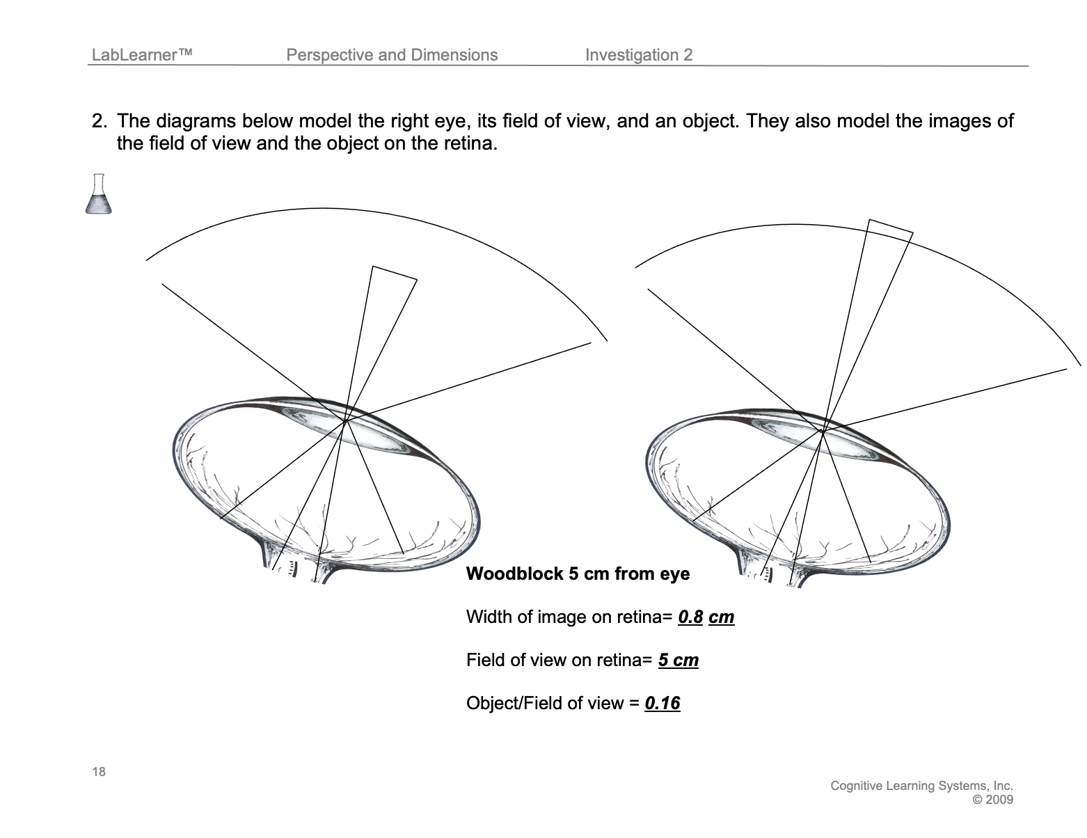 a. In each of these two drawings, the field of view for an eye and the appearance of the woodblock from Investigation One are shown at two distances (2.5 cm on the left and 5.0 cm on the right).