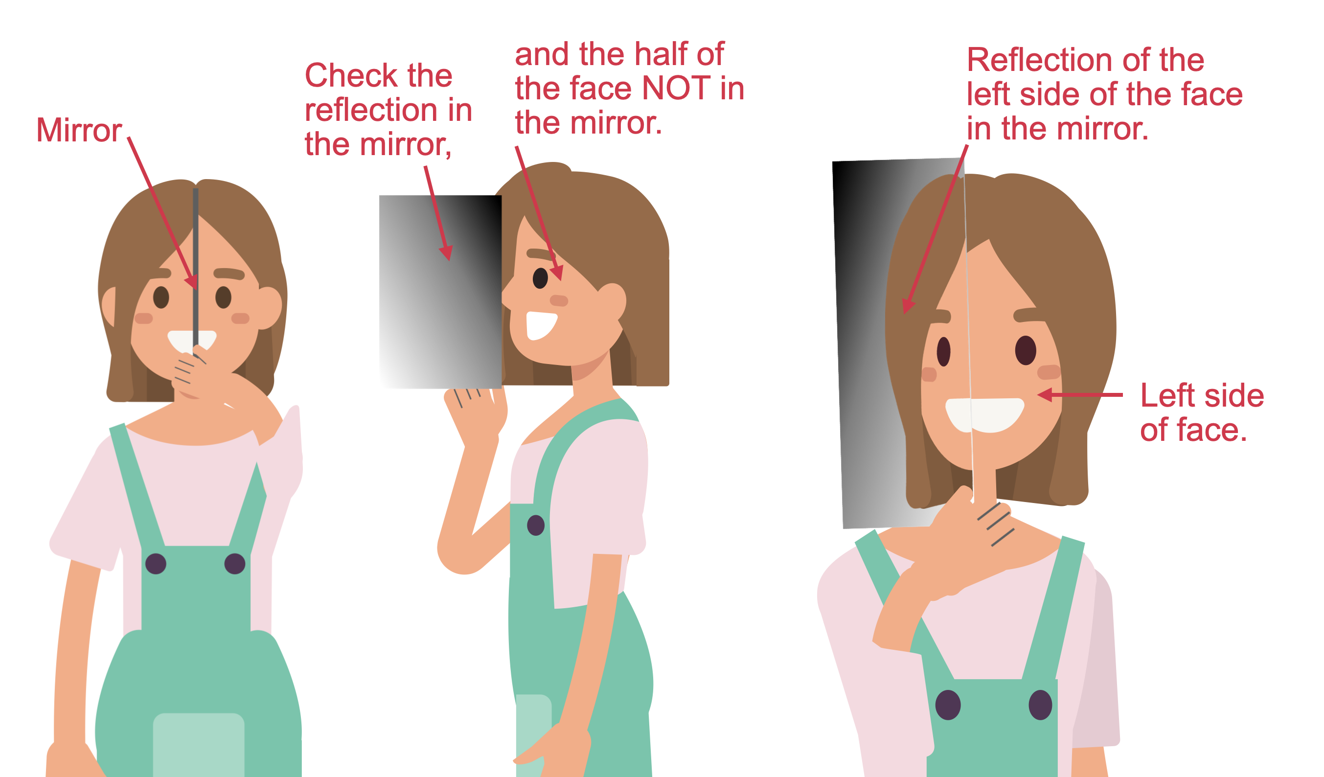 Students begin by placing the mirror down the middle of face along a longitudinal axis. When students observe the image formed by the image in the mirror and the side of the face, they should see what appears to be a complete human face with a left and right side.