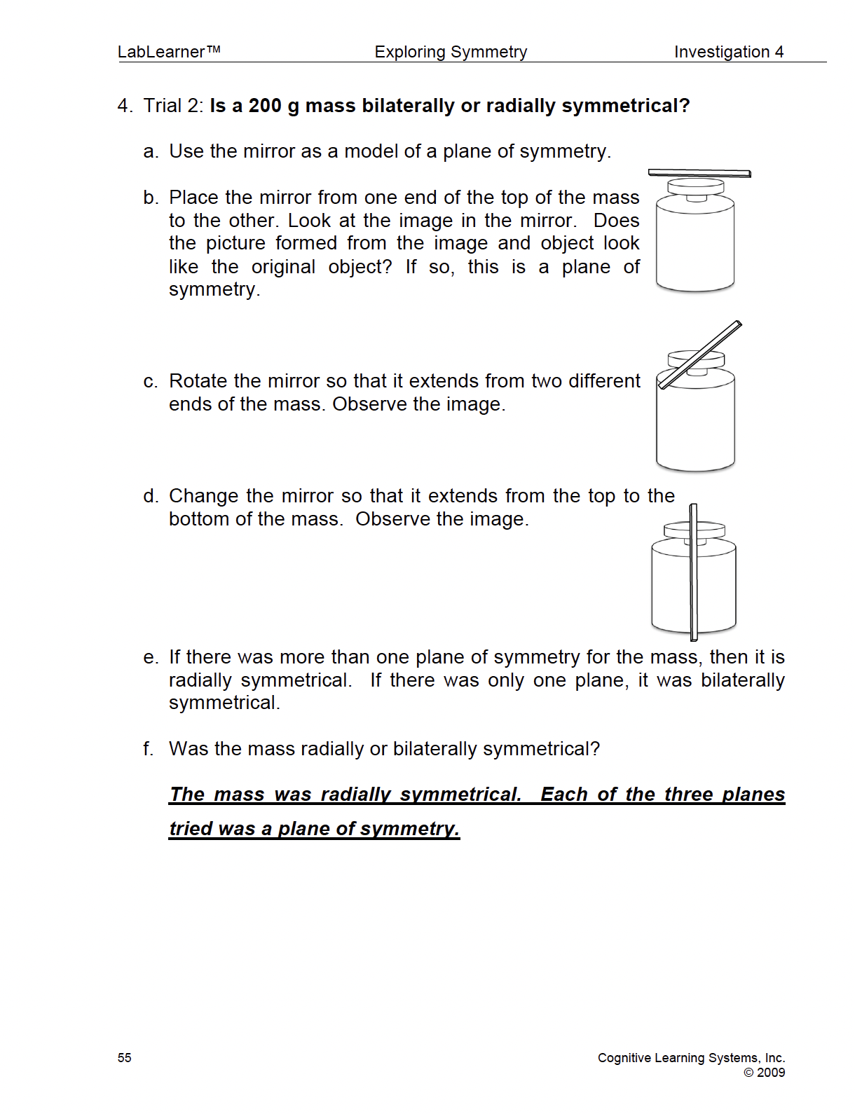 The text in their Scientist Data Record indicates that if the object appears “real” when the mirror is used, then a true plane of symmetry has been established. Students should then recognize that the line from one end of the top of the cylinder to the other is a plane of symmetry.