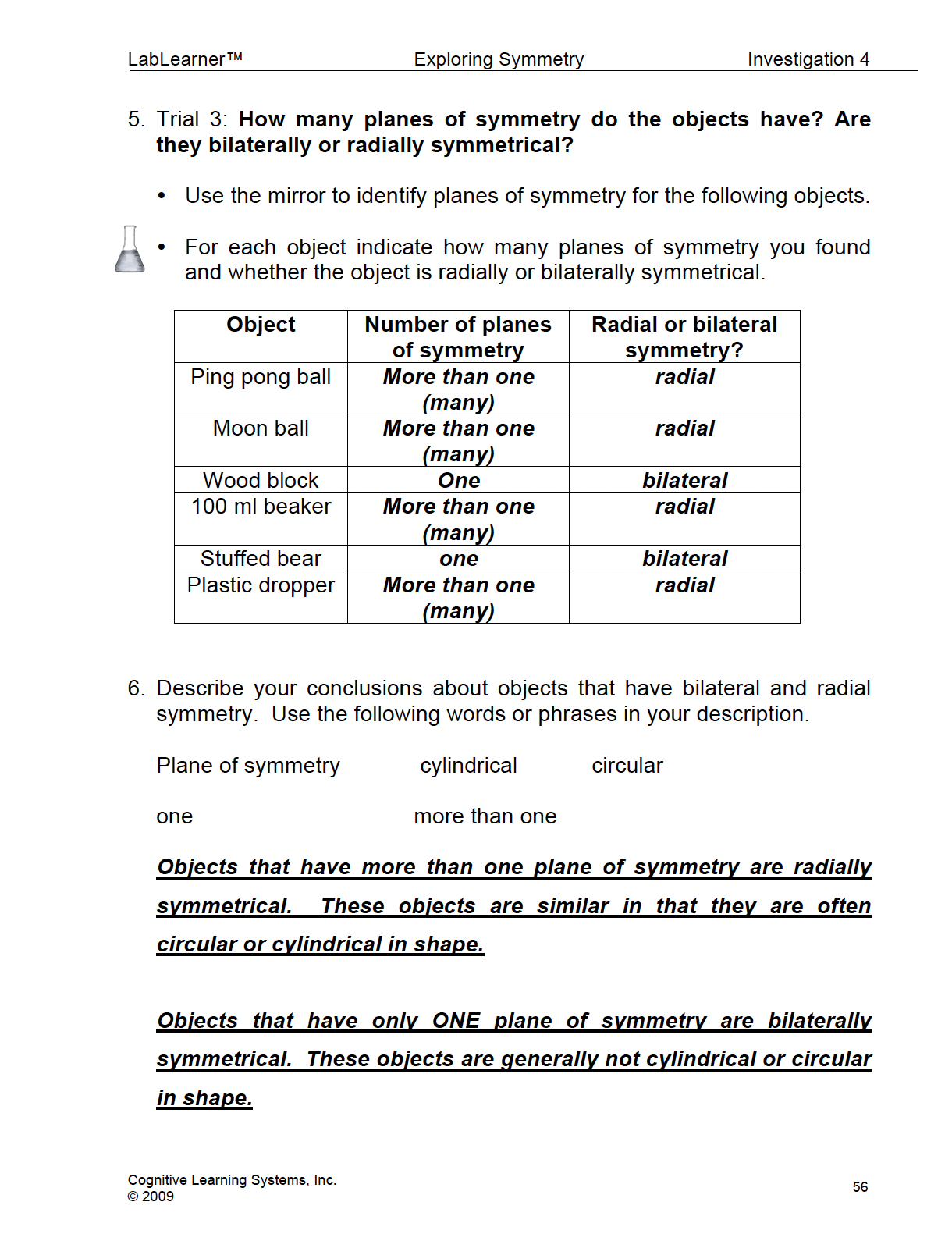 In Trial 3 students apply what they learned in Trials 1 and 2 about how to test for planes of symmetry and how to identify objects with radial and bilateral symmetry.