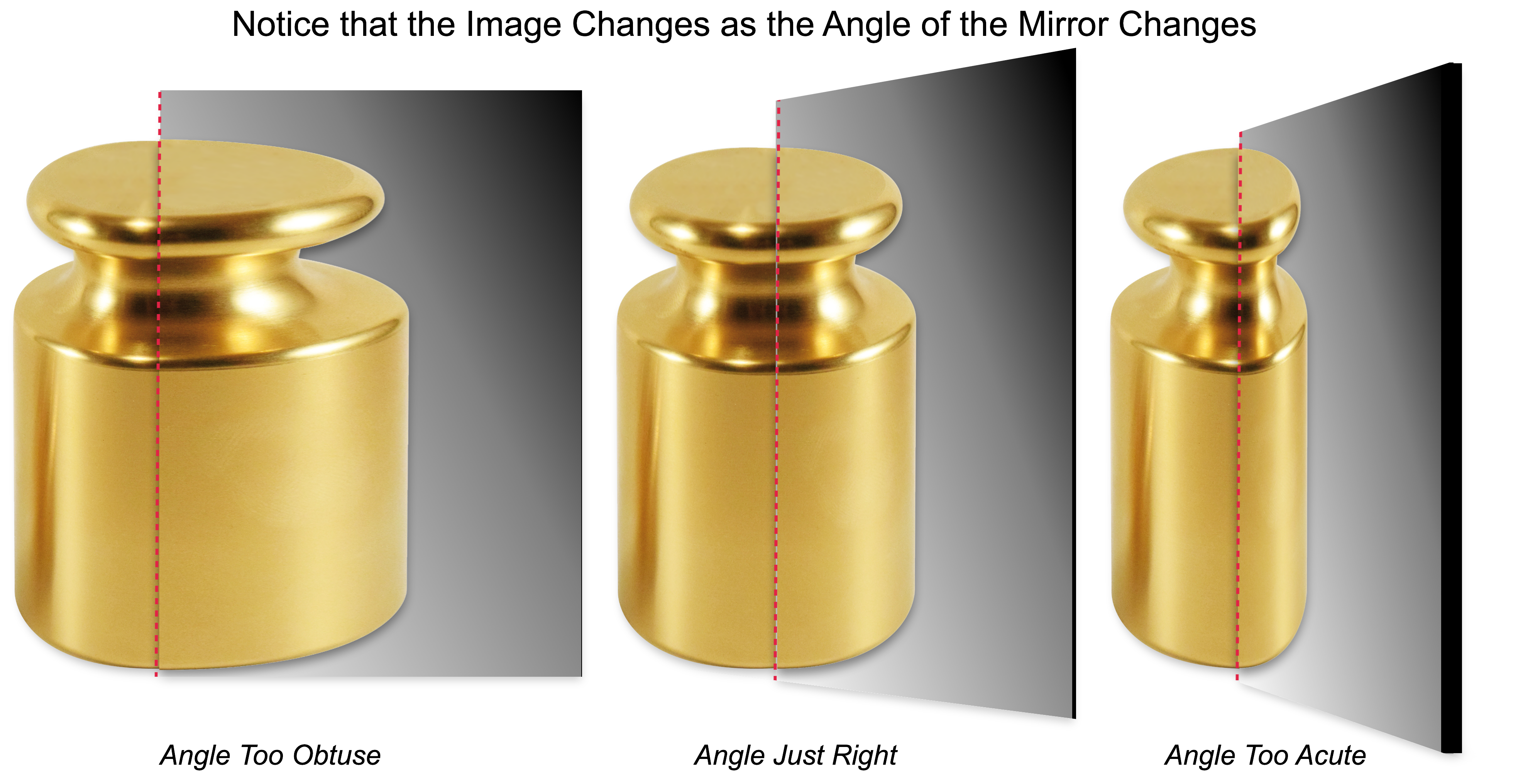 The directions in their Student Data Record for this Trial show students how to think about the possible orientations for a plane of symmetry. When students observe the image formed by the image in the mirror and the other portion of the 200 g mass, they should see what appears to be a complete 200g mass cylinder. However, they must first adjust the angle of the mirror and their viewing position, as shown below: