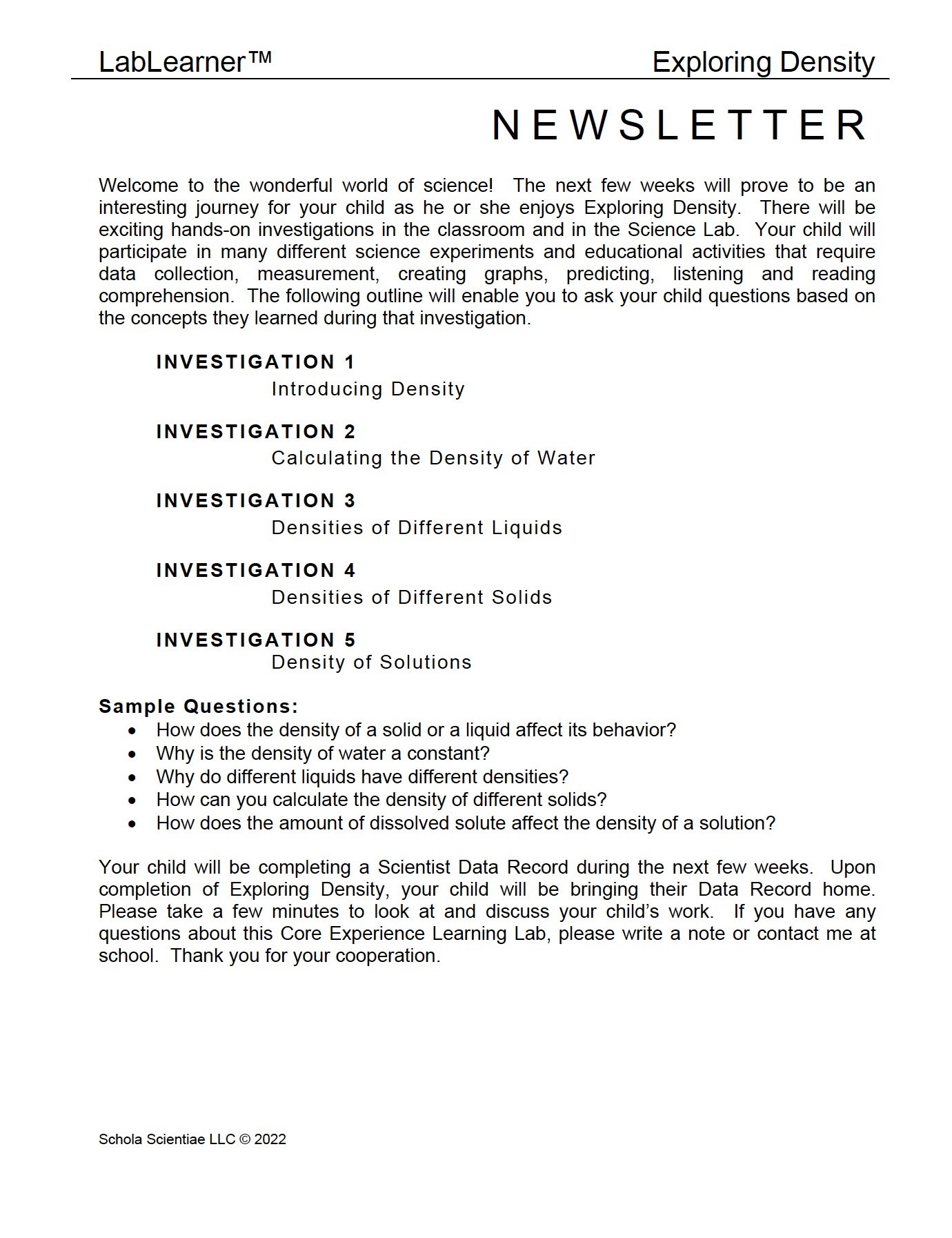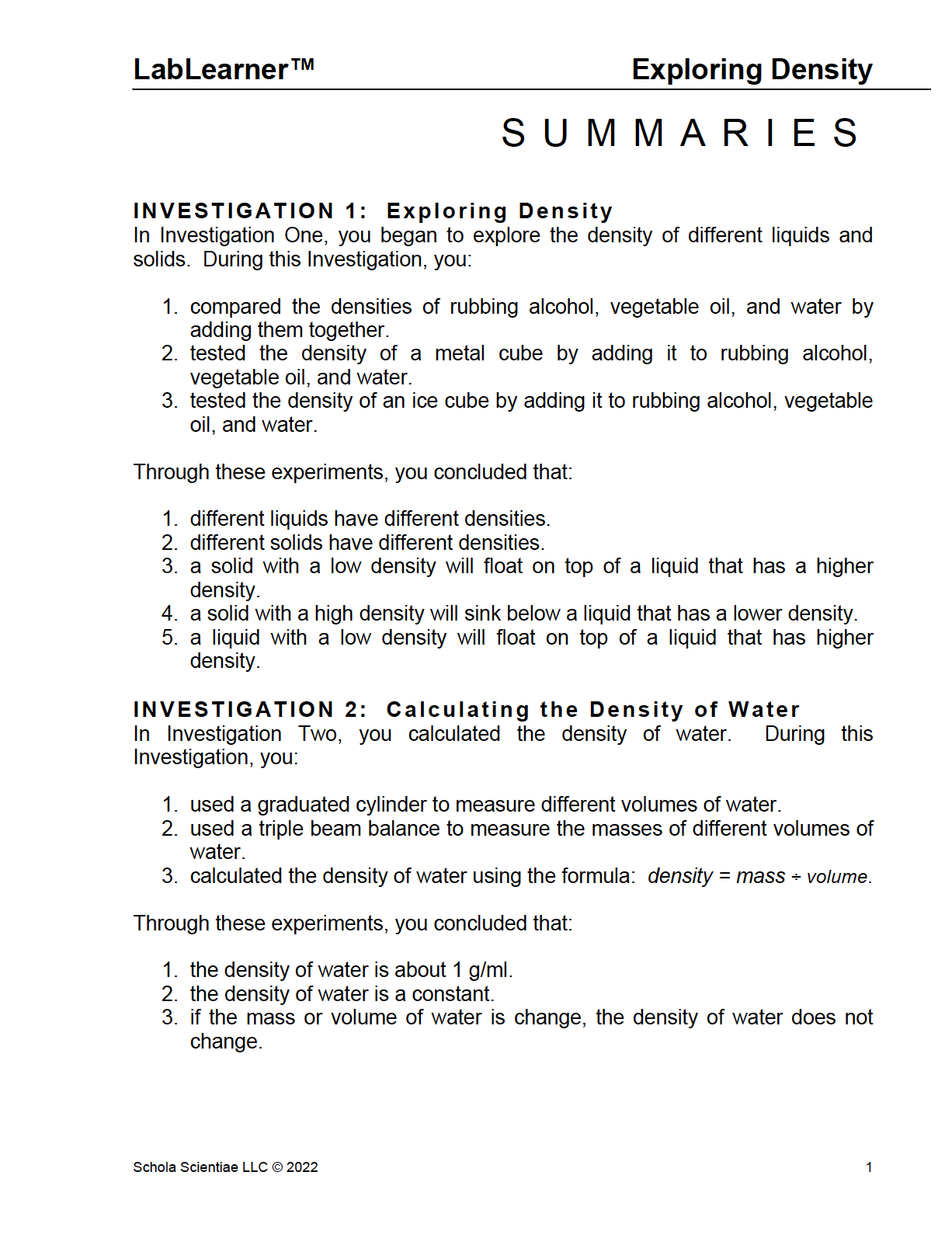 Investigation One introduces students to the concept of density. Through observation and experimentation, students will learn that different liquids and different solids have different densities. Students will use volumetric equipment to combine two different liquids and to combine liquids and solids. Their observations will enable them to realize that matter that has a low density will float above matter that has a higher density.