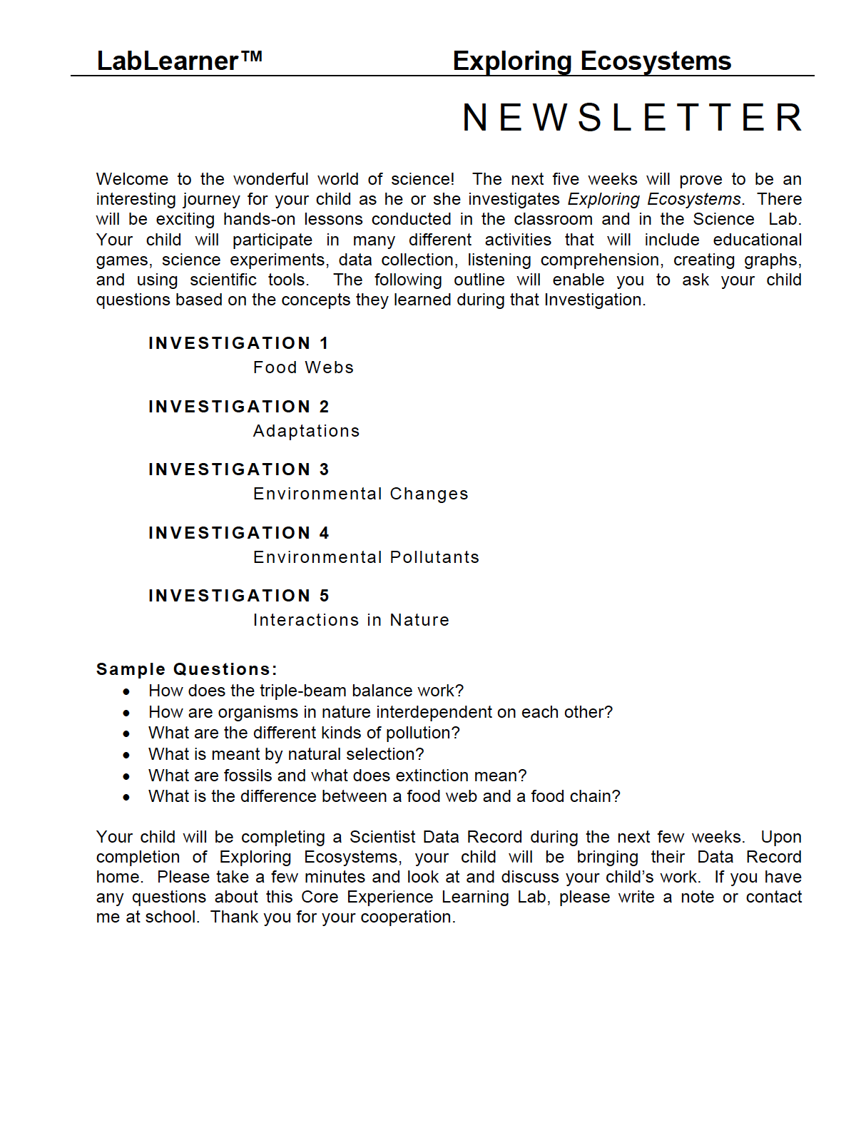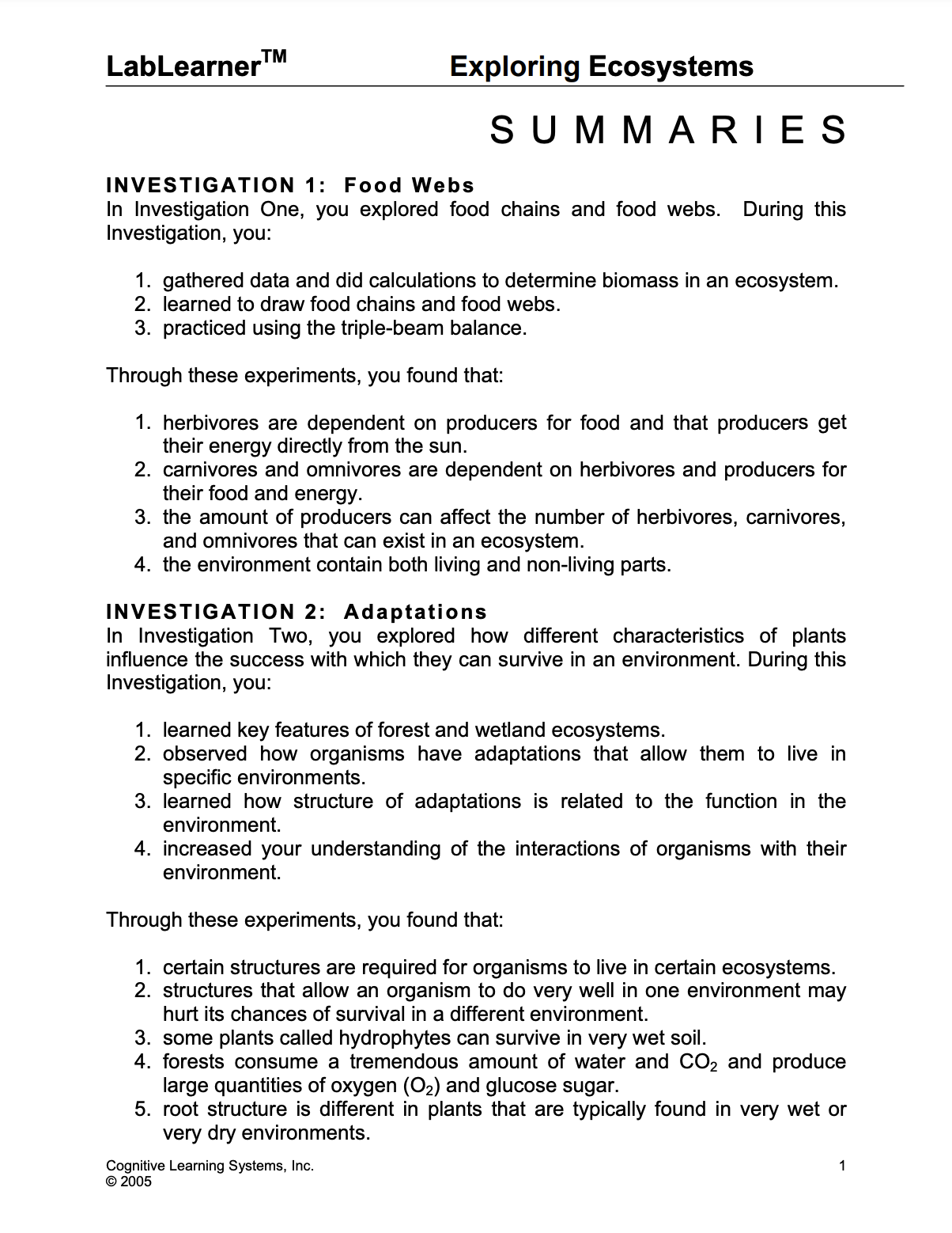 In Investigation One, students perform experiments to understand the concepts of food chains and the food webs. They gather data and do calculations to determine the total biomass in an ecosystem.