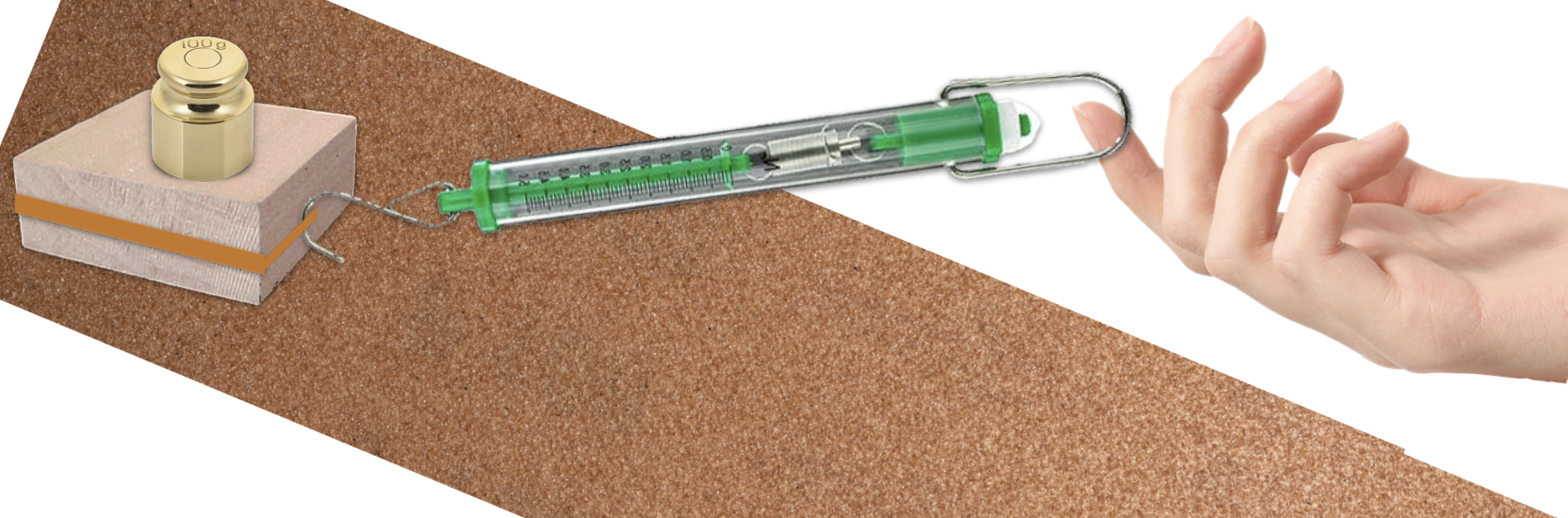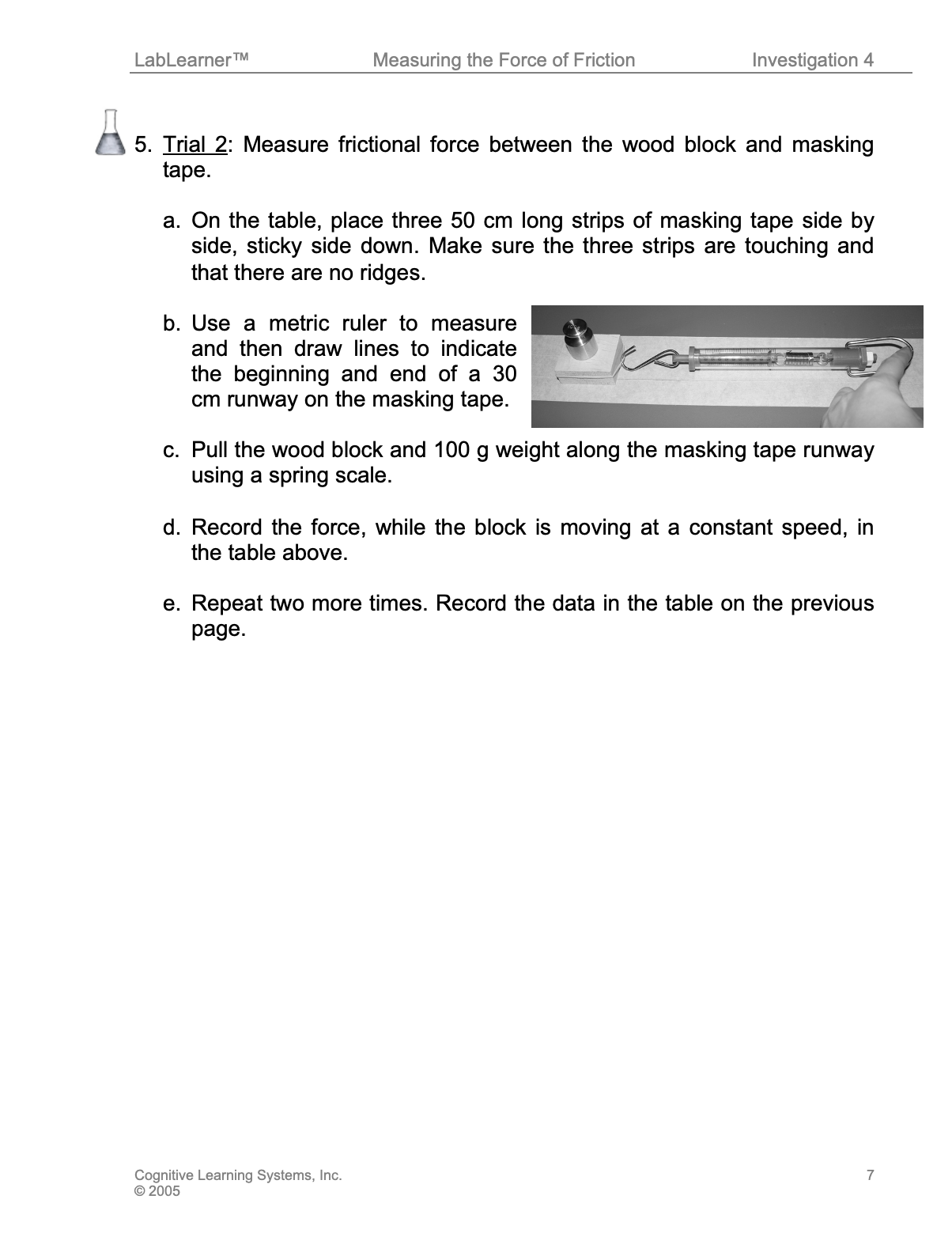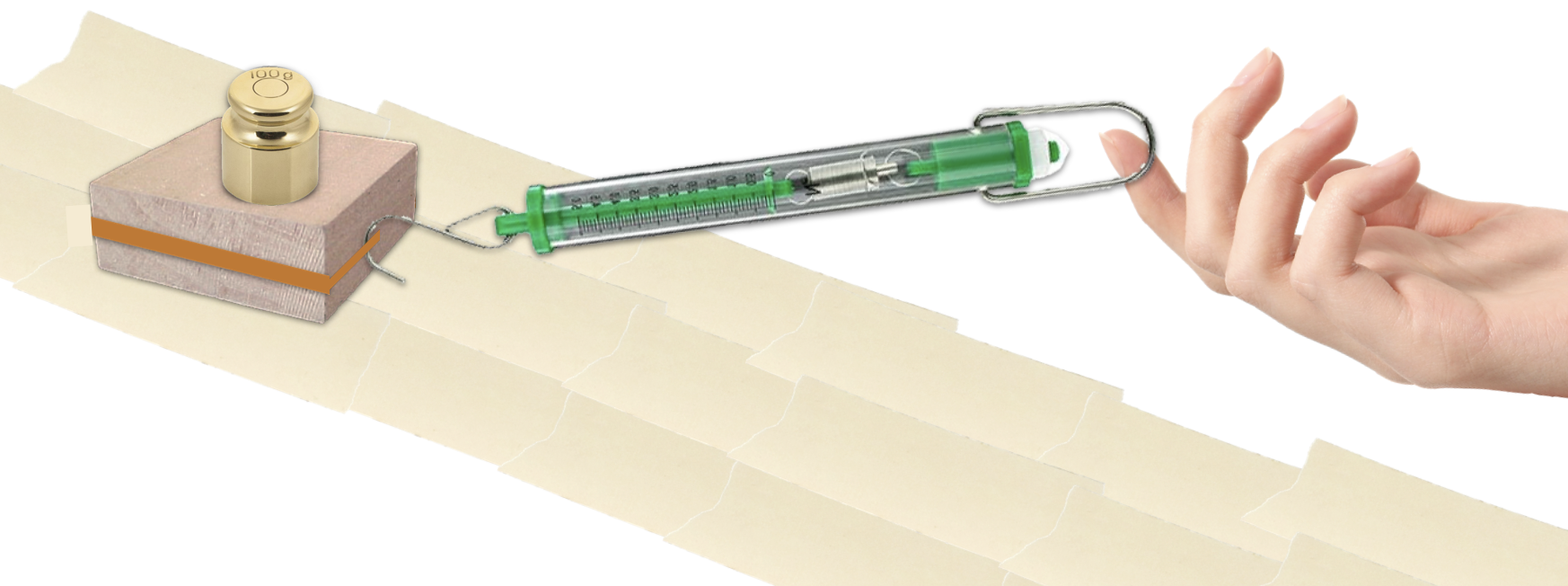 c. Pull the woodblock and 100 g weight along the masking tape runway using a spring scale.