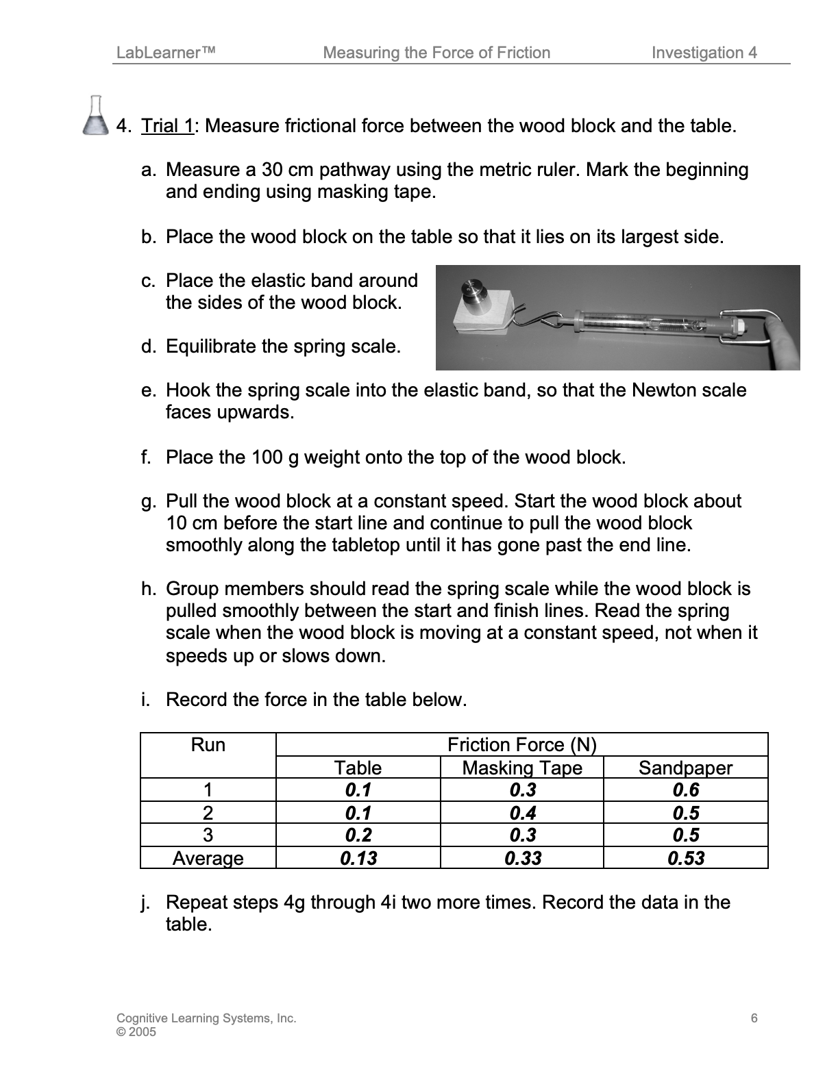 h. Group members should read the spring scale while the woodblock is pulled smoothly between the start and finish lines. Read the spring scale when the woodblock is moving at a constant speed, not when it speeds up or slows down.