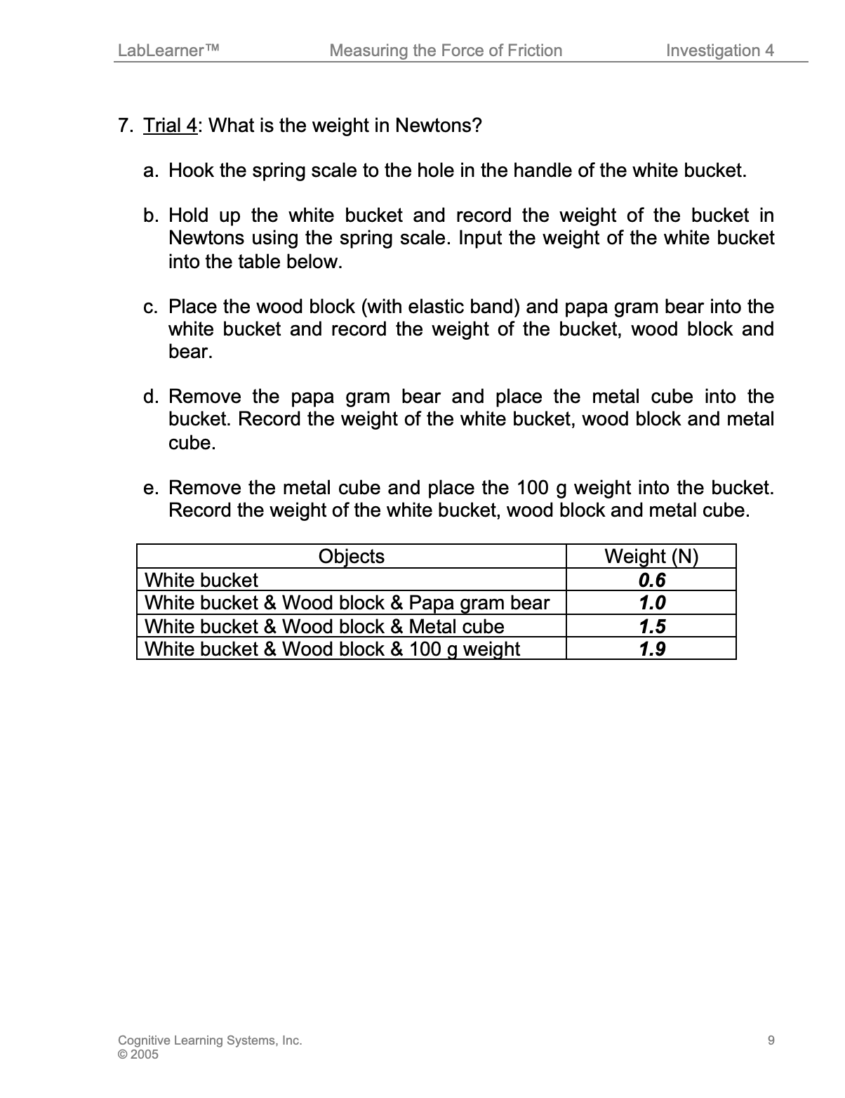 In Trial 4, students begin to explore the relationship between weight and the frictional force present when an object moves over a surface. In this Trial, students will record the weight of various configurations of objects. Students will use the spring scale to record the weight in Newtons (N), remembering that the weight in Newtons is equal to the force of gravity on an object.