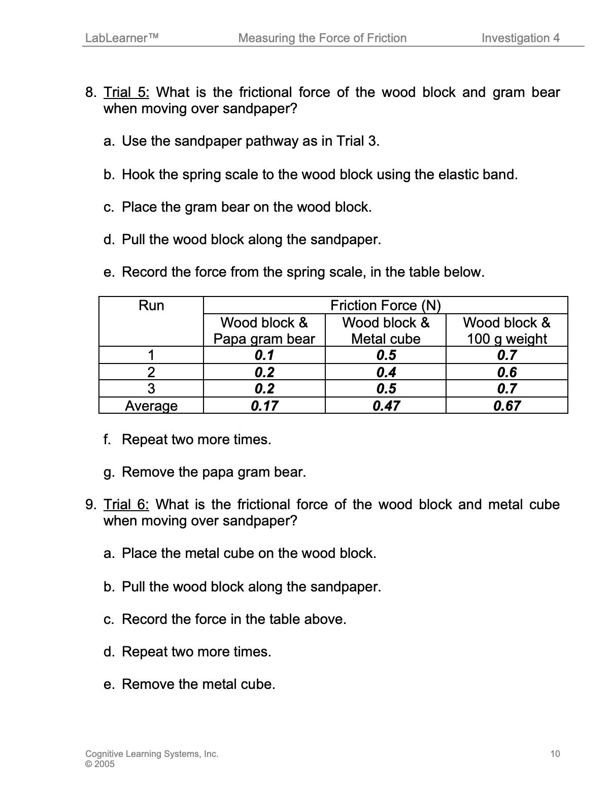 In Trial 5, students continue their exploration of variables that influence frictional force, by measuring the frictional force of a woodblock and gram bear combination. This is the combination of objects with the least weight out of the three combinations students will test. Students will use the spring scale to determine the frictional force on the woodblock with a papa gram bear on it when moving over the sandpaper.