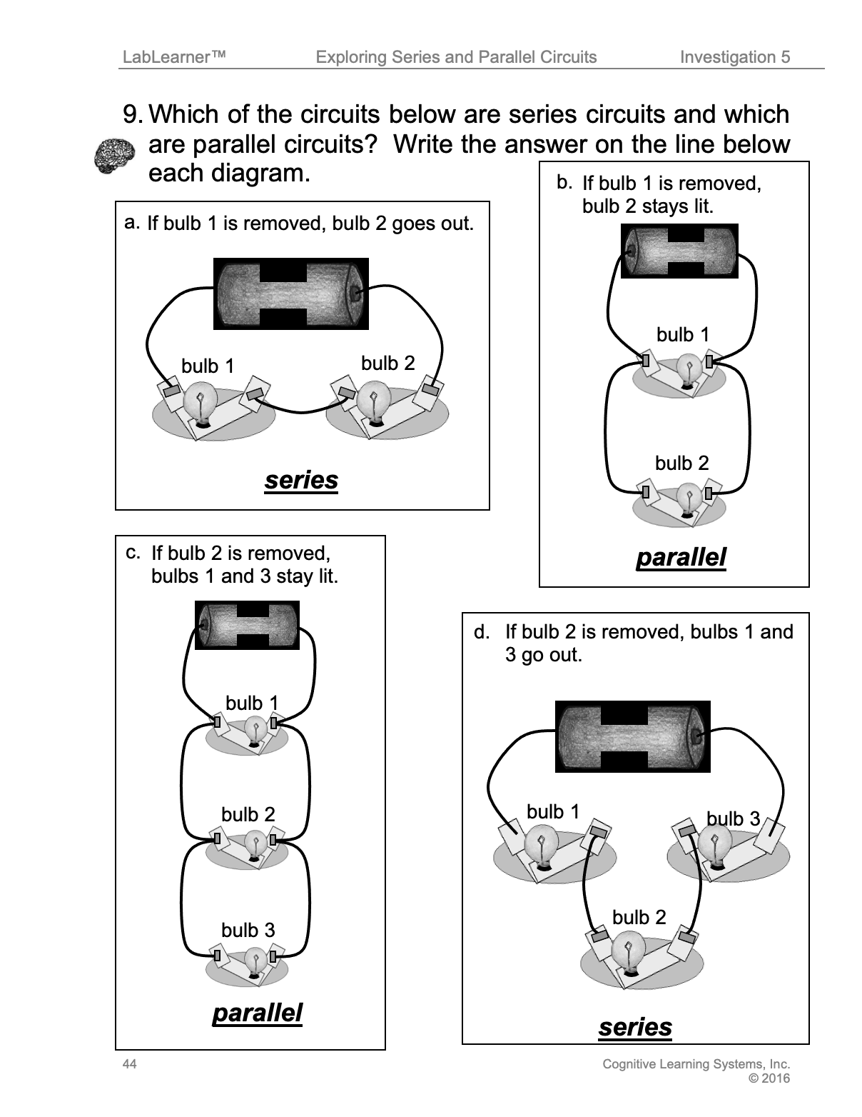3. Direct students to think about the questions, then complete their task by writing whether the circuit is series or parallel on the line beneath each circuit.