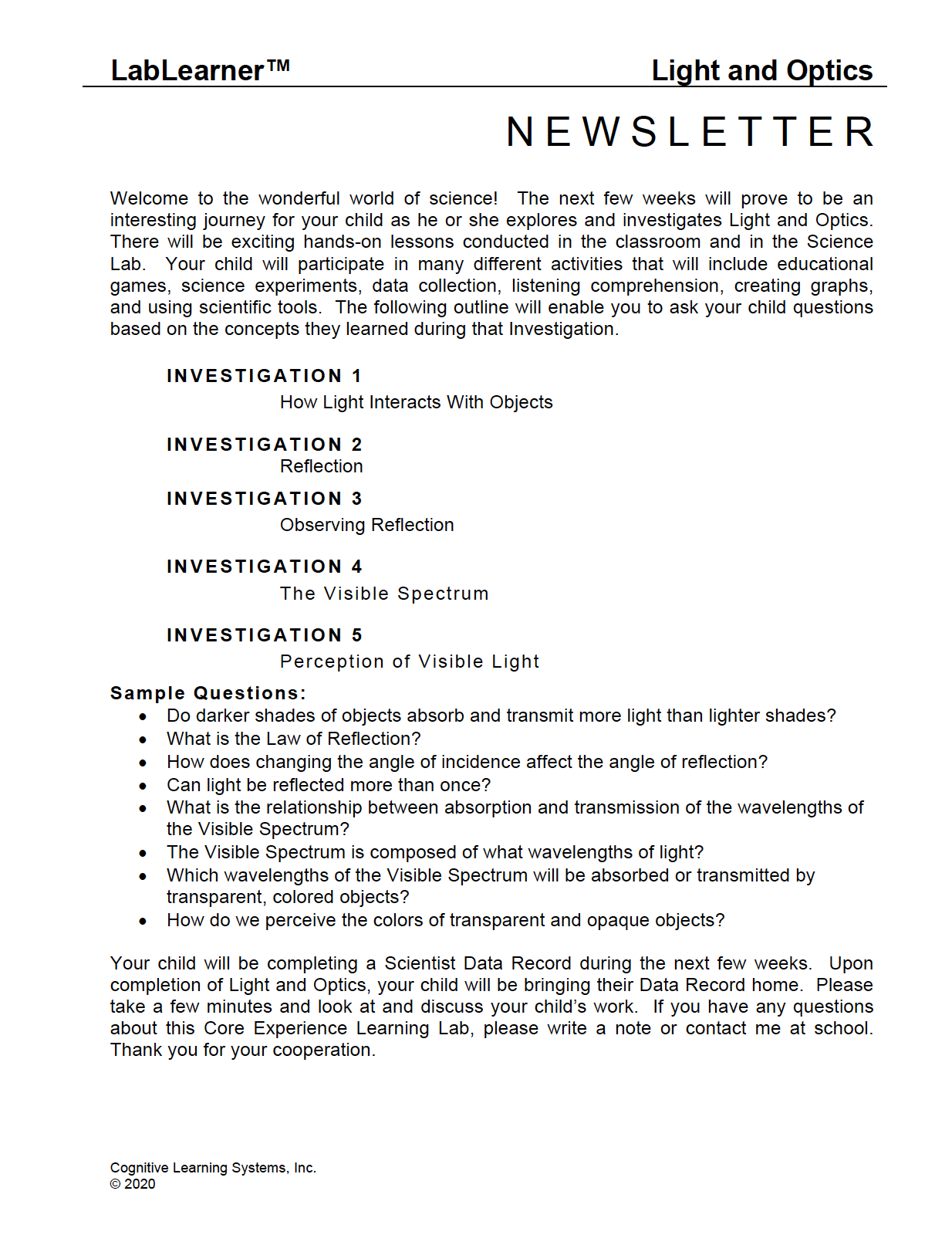 Light and Optics: Investigation 5 - Perception of Visible Light