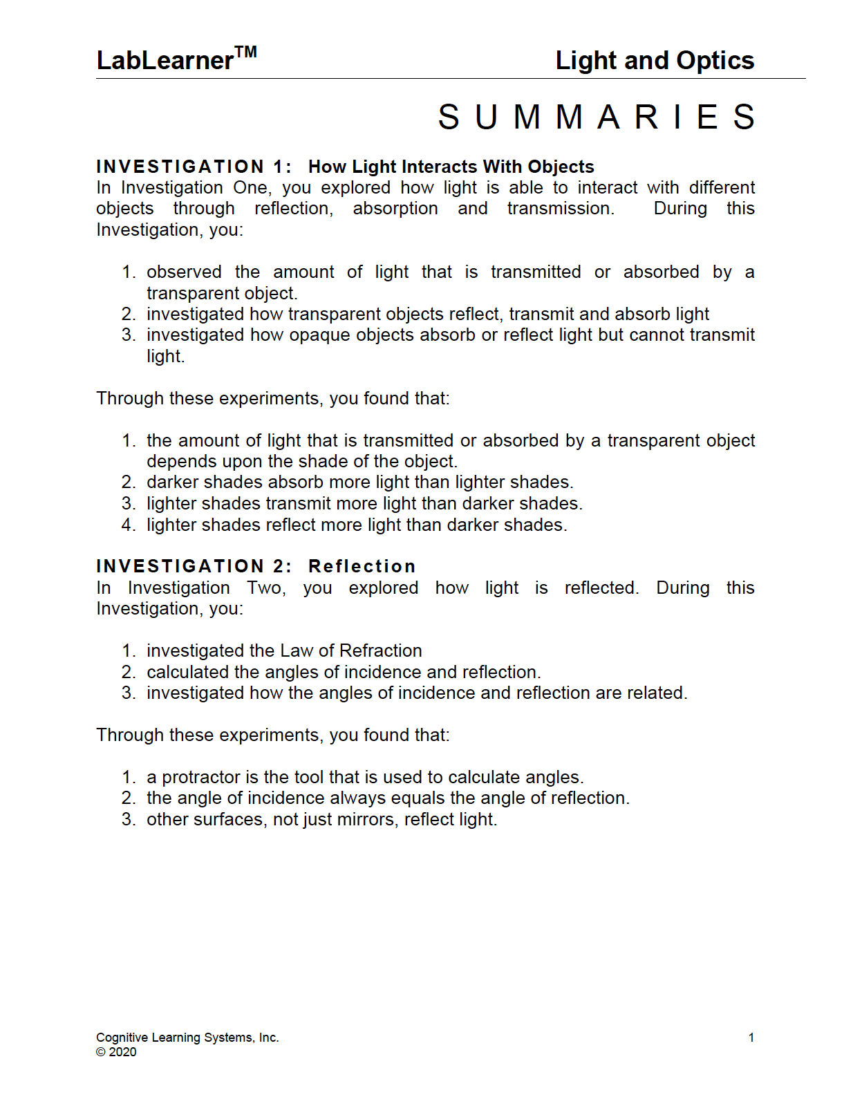 In Investigation One, students will observe that the amount of light that is transmitted or absorbed depends upon the shade of the object. A lighter shade transmits more light than a darker shade while a darker shade absorbs more light. Students will also investigate how transparent objects are able to reflect, transmit and absorb light, while opaque objects absorb or reflect but cannot transmit light.