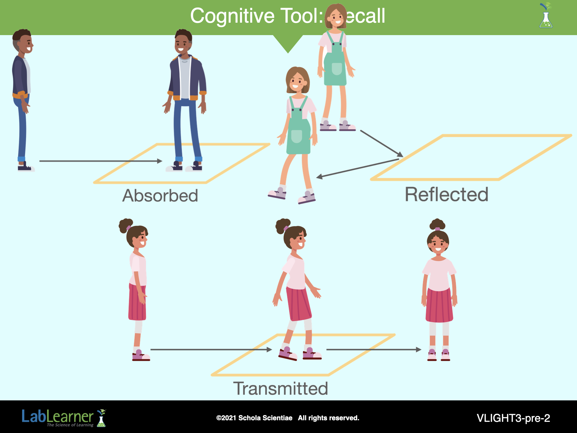 - Begin the Investigation by reviewing the concepts from Investigations One and Two. Use the activities from Investigation One, below, to briefly review absorption, transmission and reflection. Ask for student volunteers or simply refer to the slide as a means of review.