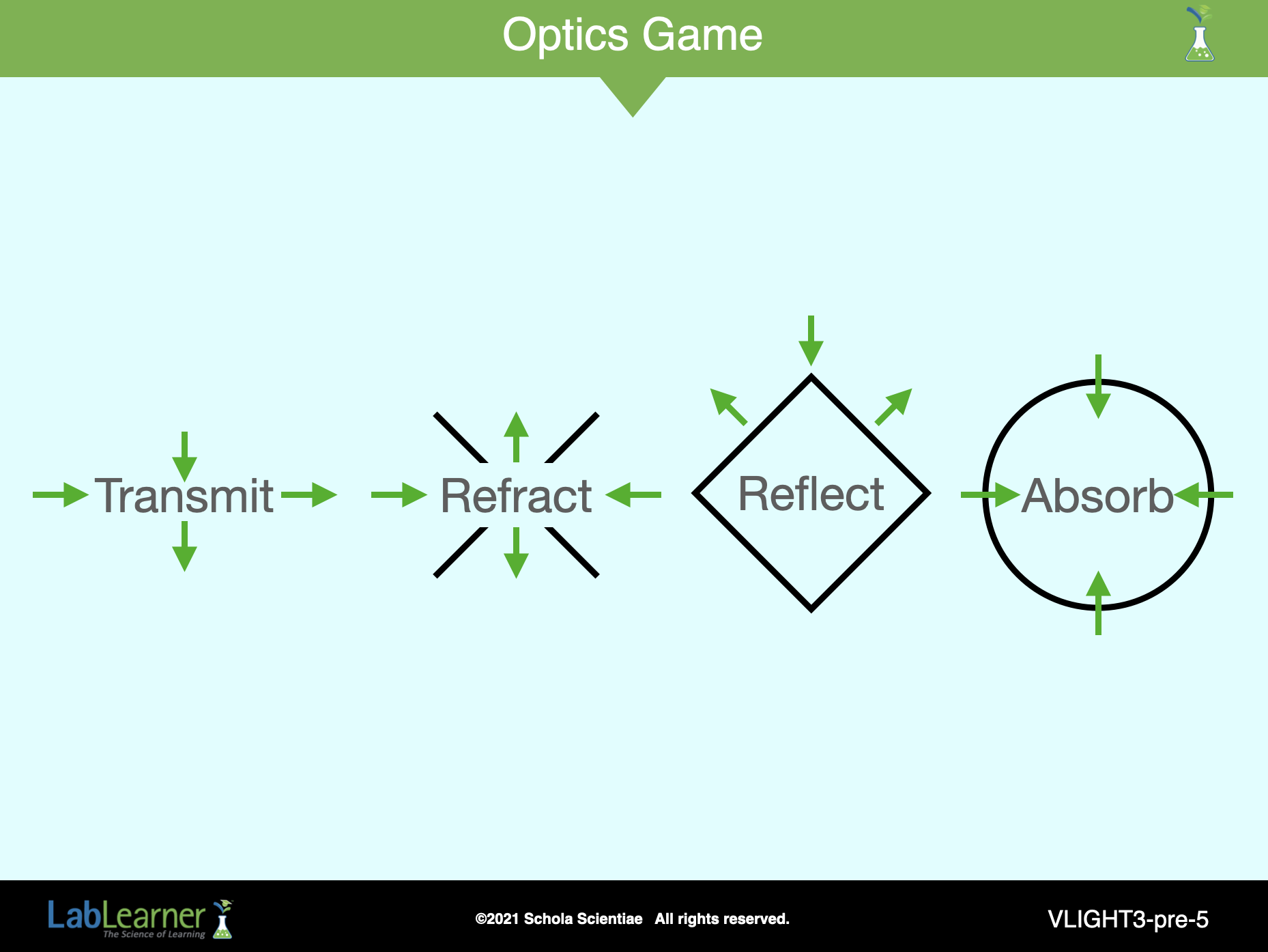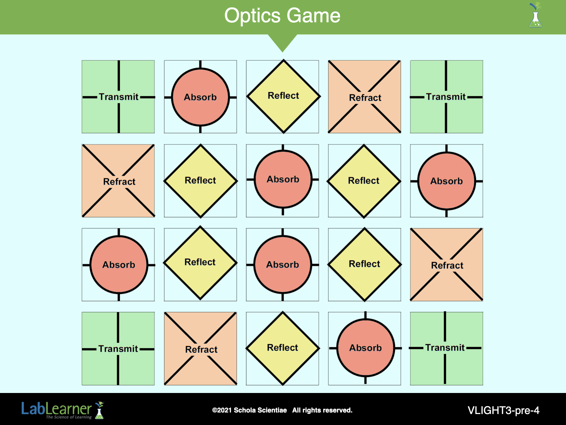 C. Inform students that to further review the absorption, transmission, reflection and refraction of light, the class will now play the Optics Game. Divide the class into pairs.