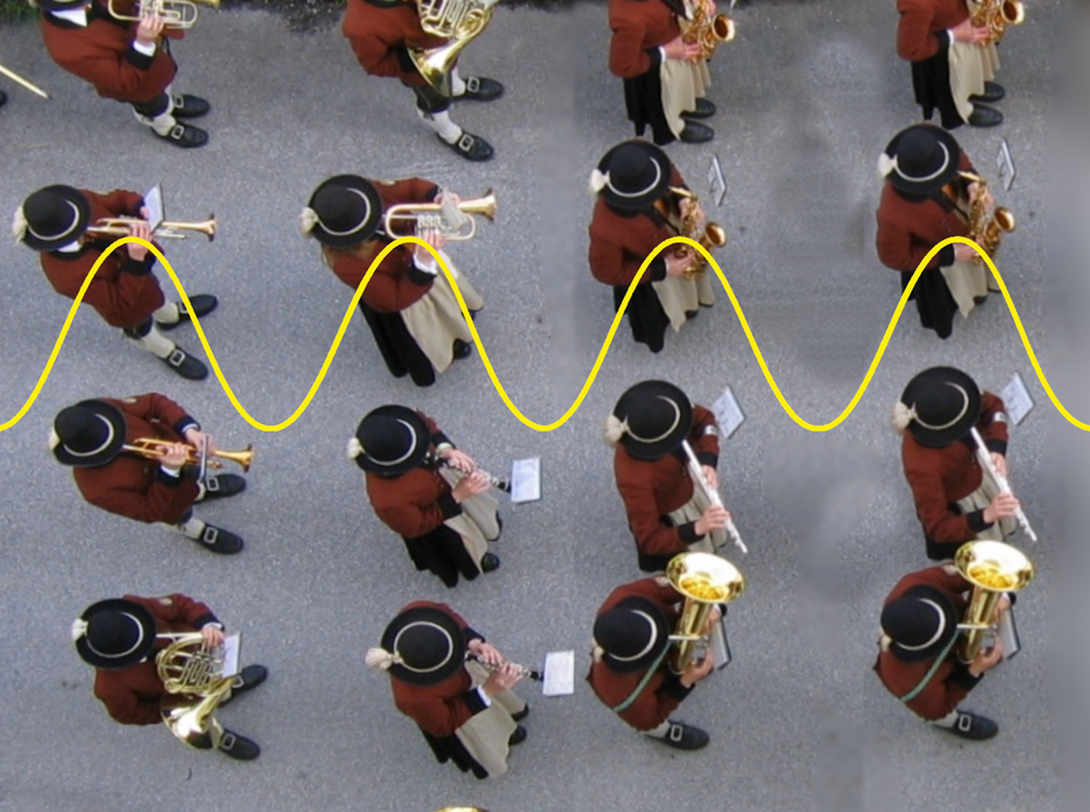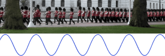 A useful analogy to describe light waves is that of two marching bands passing a spectator as they march down the street. In the first band, the rows of musicians are spaced two meters apart and in the second, the rows of musicians are spaced four meters apart. If the bands are both marching at the same speed, more rows of the first band will pass the spectator than the second band during any set time period. Stated differently, the frequency of rows passing the spectator is greater when the spacing between rows is smaller. The analogy can be directly related to light waves by assuming that each row is a crest, the distance between rows is the wavelength and the number of rows passing the spectator during a certain time period is the frequency.