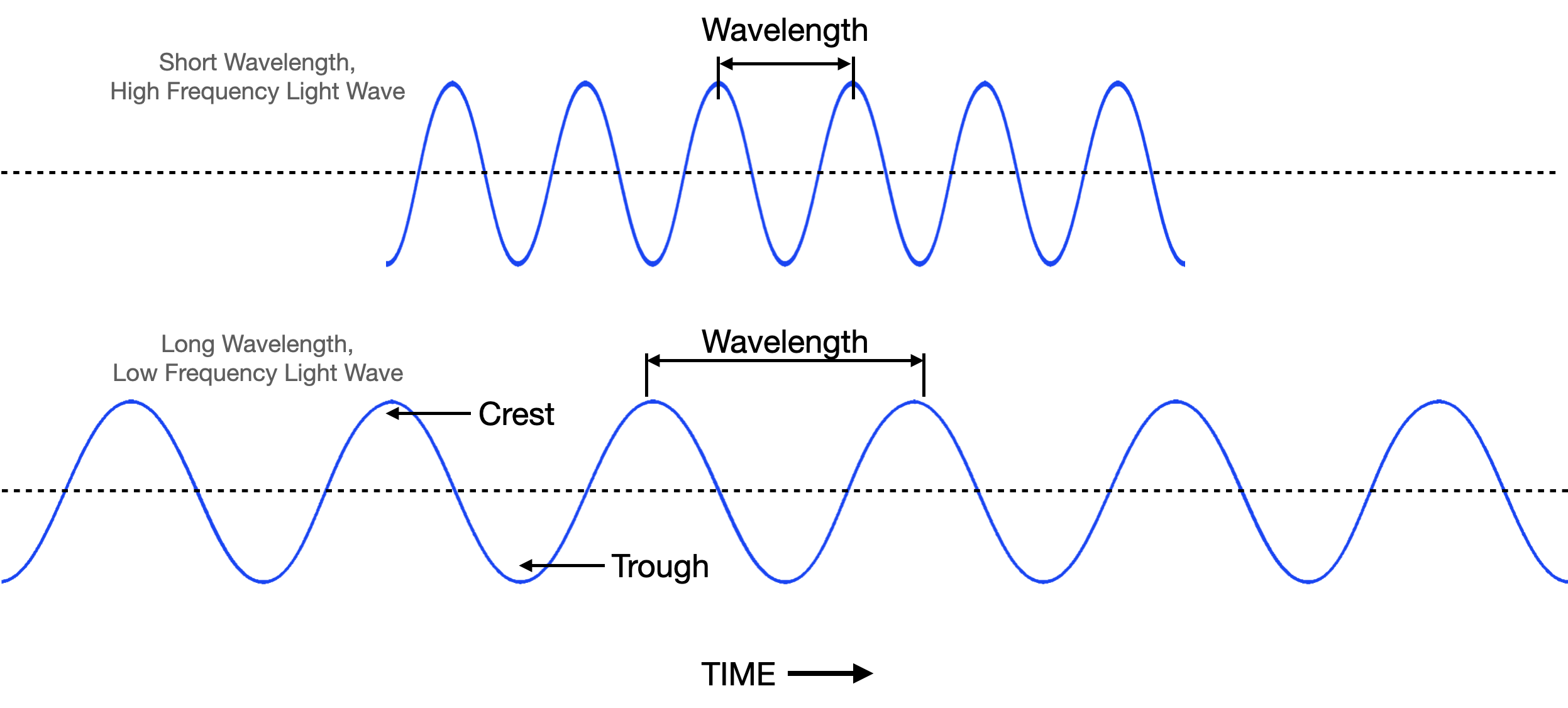 For example, the two light waves shown above each possess six crests and six troughs. The top wave possesses a wavelength that is one-half the wavelength of the bottom wave. Since the speed of light, is a constant, in the time it takes all the crests of the first wave to pass a stationary point, only three crests of the second will pass. The frequency of the crests of the first wave is greater than the frequency of the crests of the second wave.