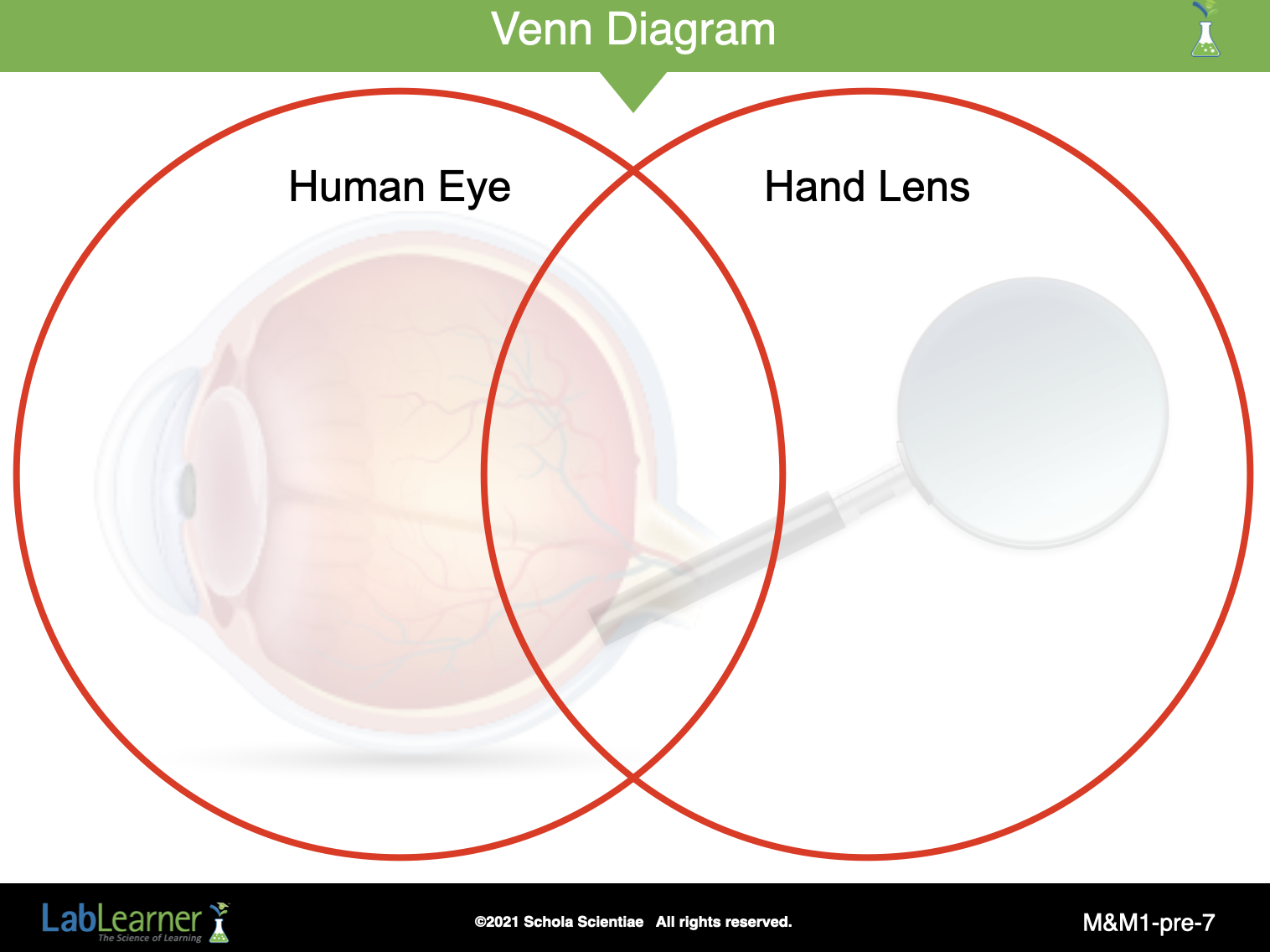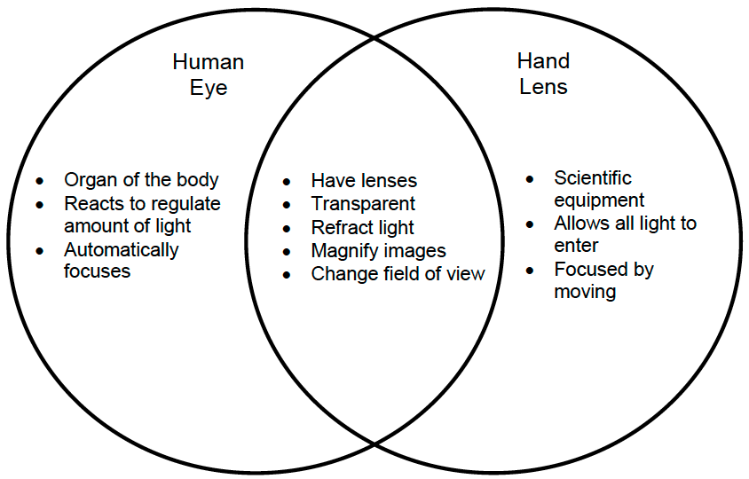 Ask students to refer to Problem 18 in their Student Data Record. Student partners should work together to draw a Venn diagram that shows the similarities and differences between the parts and functions of the human eye and a hand lens.