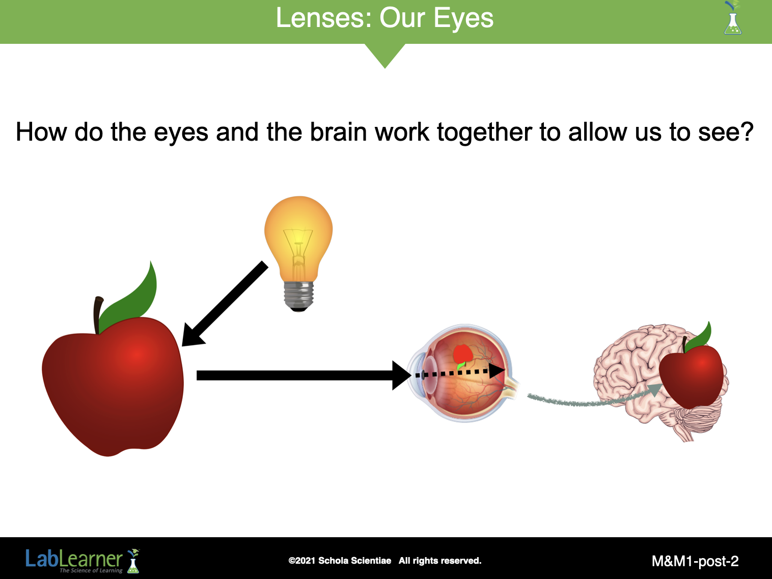 Ask Students: How do the eyes and the brain work together to allow us to see? When you look at an object, light from the object passes through the outer layer of the eye, called the cornea, and then through an opening called the pupil. Next, the light passes through a lens that focuses the image of the object onto a structure in the back of the eye called the retina. Cells in the retina send nerve signals through the optic nerve to the brain. The brain interprets the signals and allows us to identify the object.
