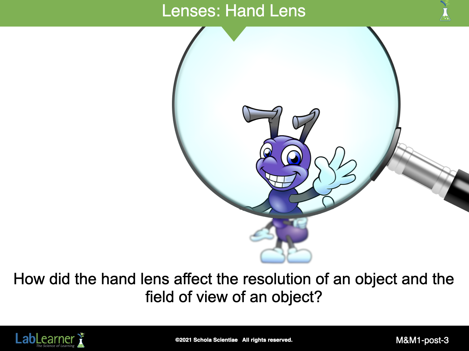 Ask students: How did the hand lens affect the resolution of an object and the field of view of an object? The hand lens increased the resolution of an object but decreased the field of view. In the experiment, students could see the details of their partner’s eye better with the hand lens but the hand lens only allowed them to view a small area of their face.