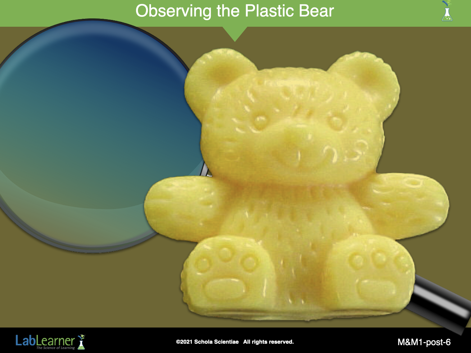 Ask students: How does the hand lens assist the naked (unassisted) eye? Describe your observations of the wood block and the bear with and without the hand lens. Student answers will vary. Students should have been able to see greater detail with the hand lens but may not have been able to see the entire object.
