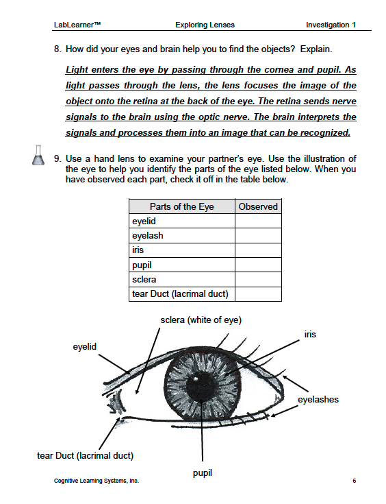 - How did the hand lens help you see the parts of your partner’s eye? Student answers will vary. Students should note that the hand lens allowed them to see the parts of the eye in greater detail.