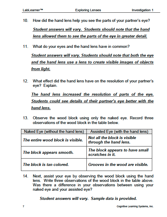 - What do your eyes and the hand lens have in common? Student answers will vary. Students should note that both the eye and the hand lens use a lens to create visible images of objects from light.