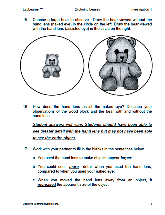 Ask students: How does the hand lens assist the naked (unassisted) eye? Describe your observations of the wood block and the bear with and without the hand lens. Student answers will vary. Students should have been able to see greater detail with the hand lens but may not have been able to see the entire object.