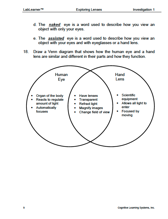 Ask students to refer to Problem 18 in their Student Data Record. Student partners should work together to draw a Venn diagram that shows the similarities and differences between the parts and functions of the human eye and a hand lens.