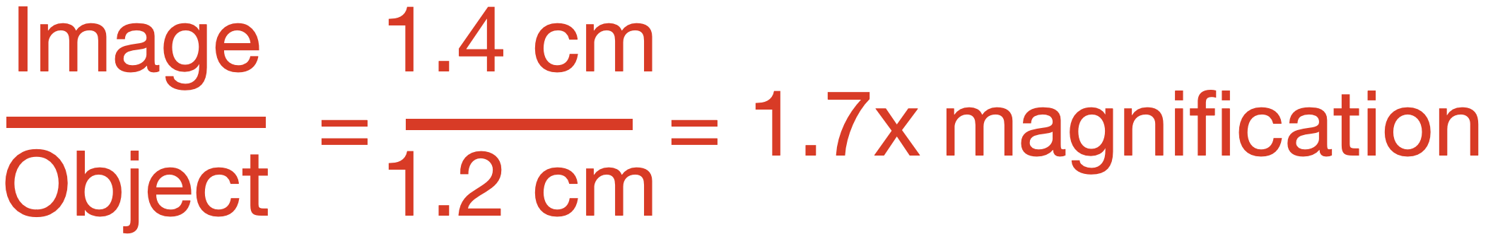 Finally, using actual classroom data shown on the previous slide ( object = 1.2 cm, image = 1.4 cm), Calculate the magnification of the hand lens.