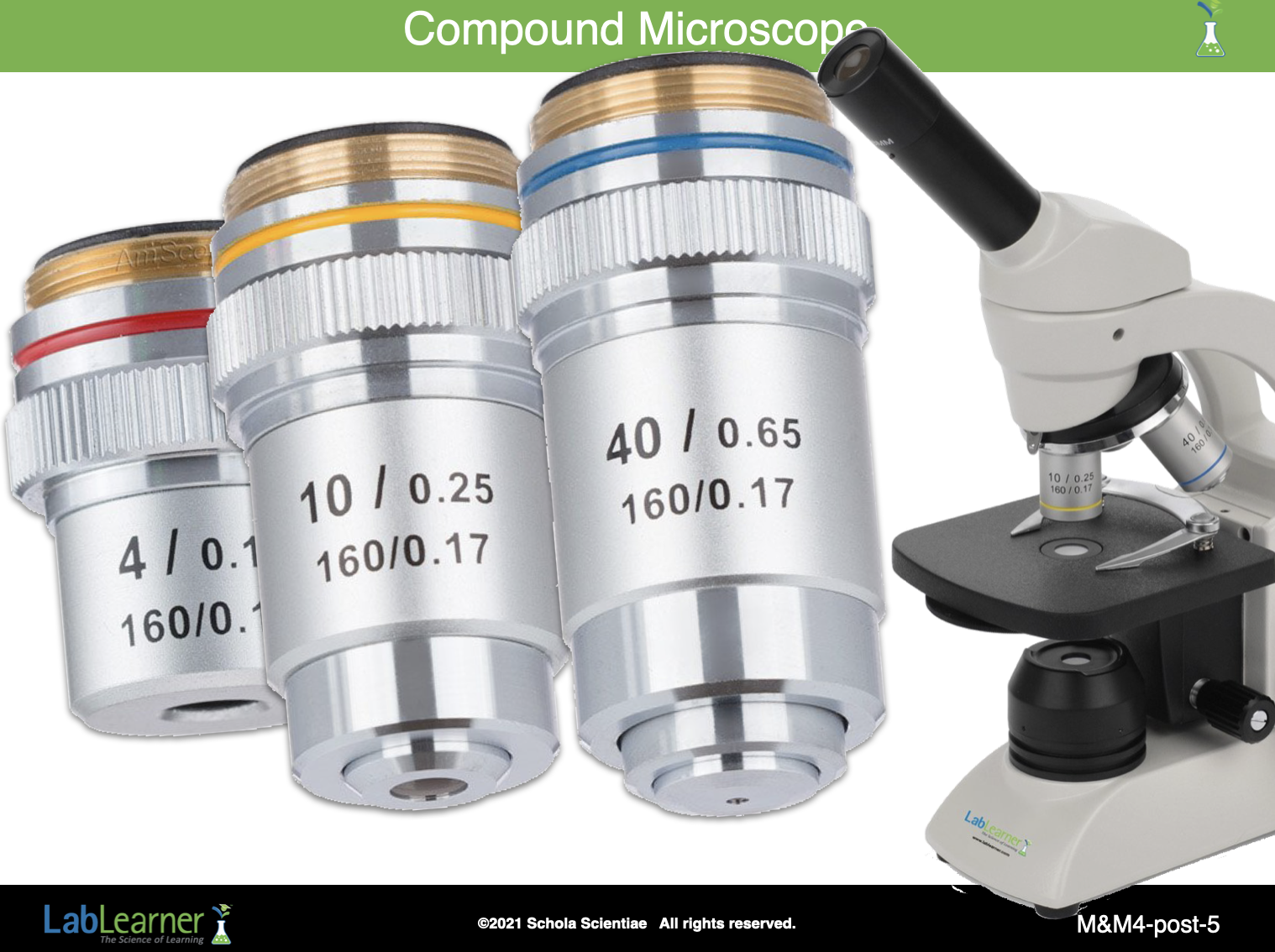 Review how to calculate the total magnification of each objective of the compound microscope. This slide has been seen before and should facilitate discussion of how to calculate the power of magnification.