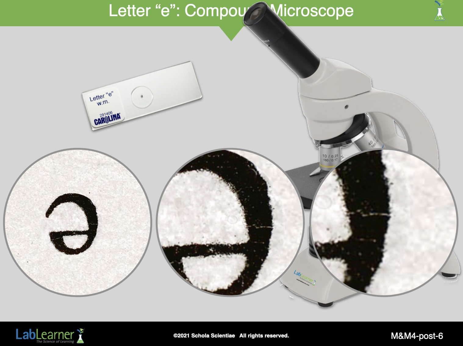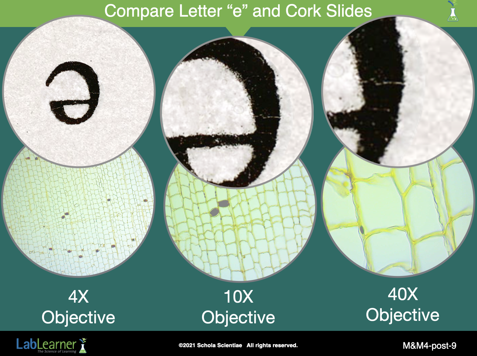 Ask students to describe the image of the letter “letter e” when viewed using each of the three objectives: