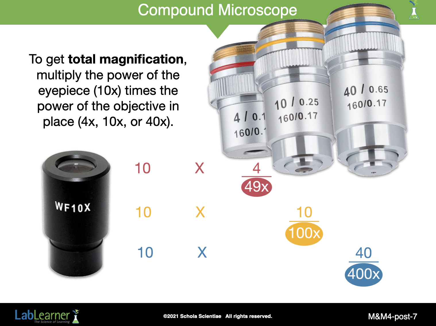 Remember, the total magnification is calculated by multiplying the magnification of the objective by the magnification of the eyepiece.