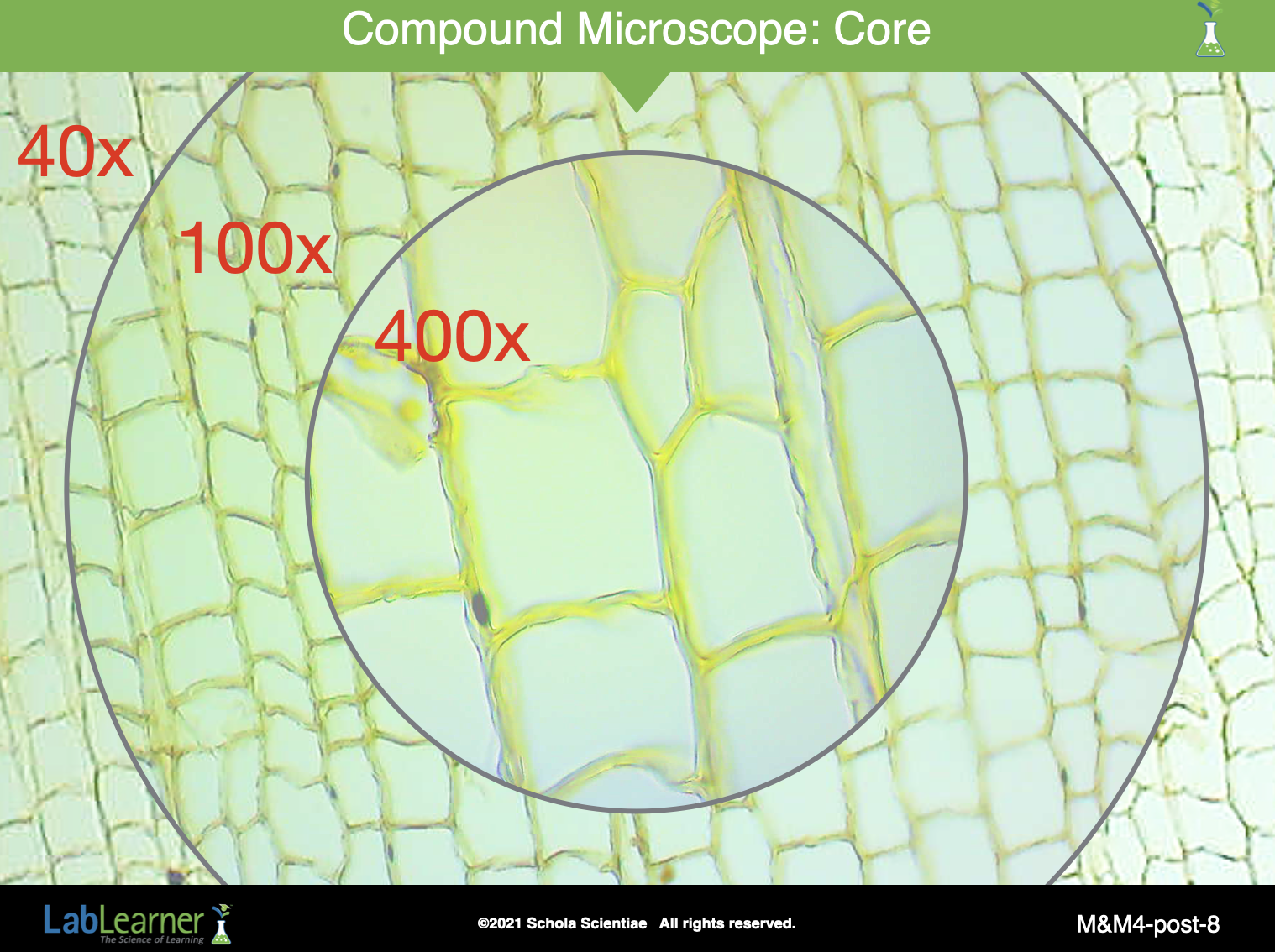 Begin a discussion of students’ observations of the cork slide. Direct students to Problem 6 in their Student Data Record. This slide shows three different images of the prepared cork slide with the total magnification indicated for each image.