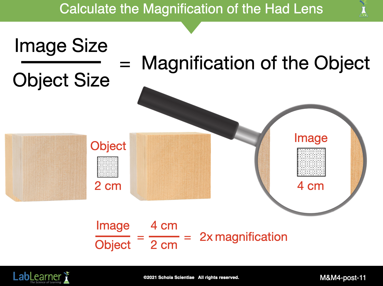 • A square has a width of 2 centimeters. If a lens increases the width of the image to 4 centimeters, what is the power of magnification of that lens? 2x magnification