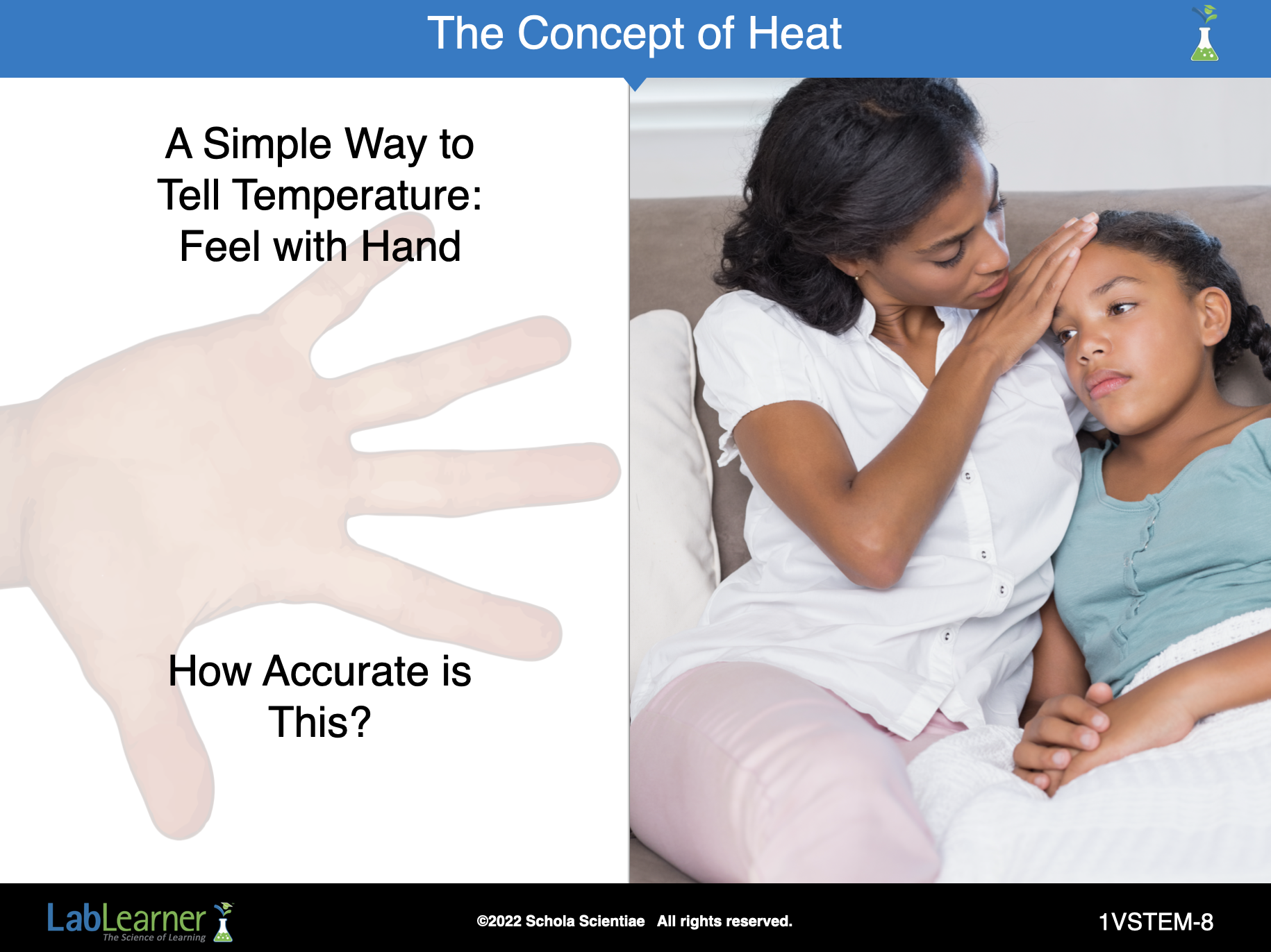 When we look at heat from a Science perspective, we can do experiments. To address if the mother feeling the girls forehead as a sign of fever is an accurate way to determine temperature, we might perform the experiment outlined on this slide.